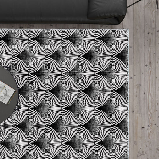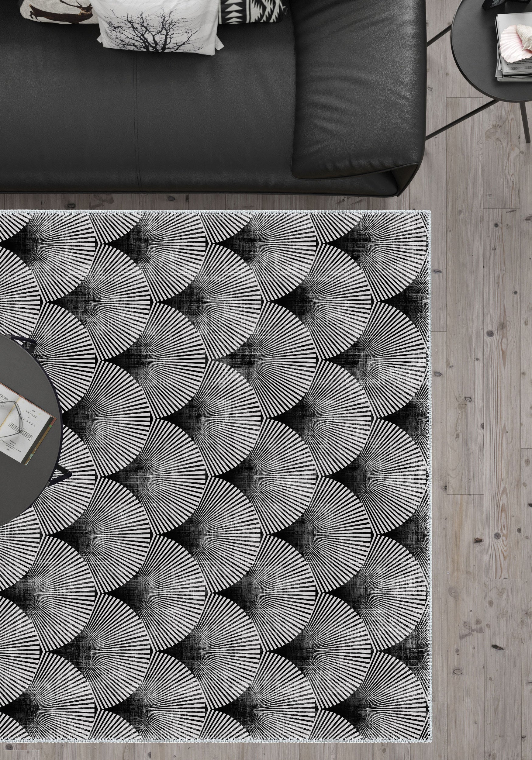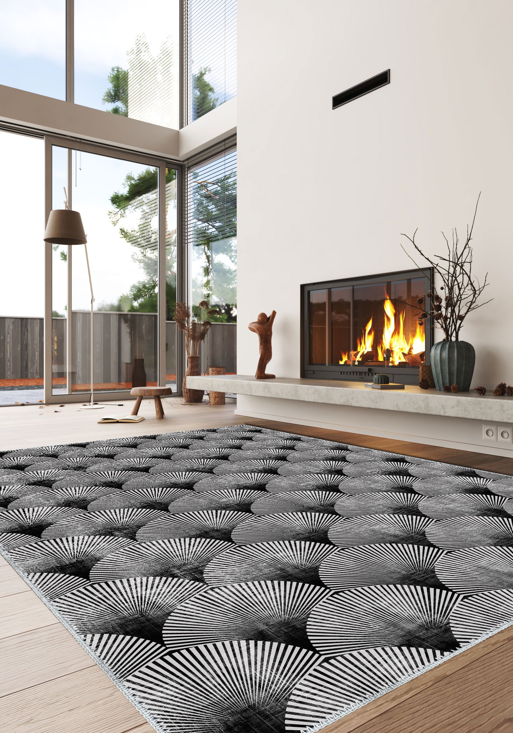 Transform your living space with the Addison Geometric Anthracite Rug. This rug features a striking geometric fan pattern in monochromatic tones that offers a modern, sleek look for any room. Crafted from durable, washable materials, it combines style and practicality effortlessly.