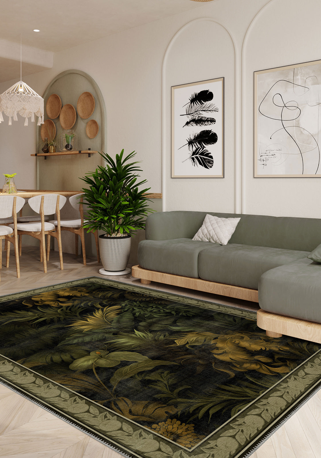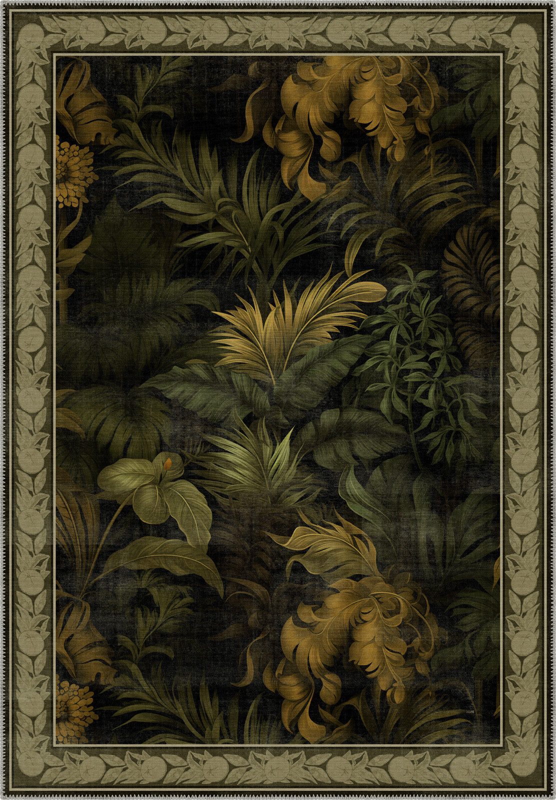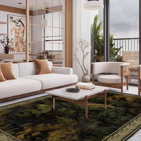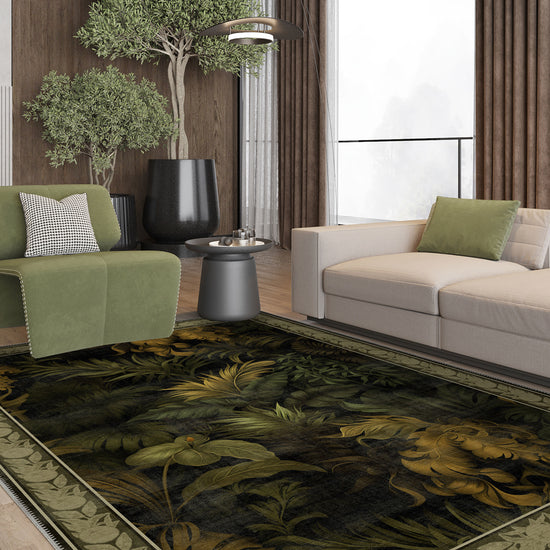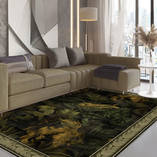 The Alaric Floral Green Rug captures the lush beauty of nature with its intricate botanical design, perfect for adding elegance and warmth to any room. Featuring deep green foliage complemented by warm golden accents, this rug brings a luxurious yet organic feel to your interior. The detailed border further enhances its sophisticated appeal, making it an ideal choice for traditional, exotic, or vintage-inspired spaces. With the added practicality of being machine washable, it combines style with everyday functionality.