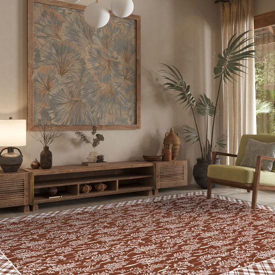 Step into a world of warmth and rustic refinement with the Alder Floral Terracotta Rug. A charming blend of nature-inspired design and homely comfort, this piece brings the gentle rhythm of the outdoors into your everyday life. Its rich terracotta base sets a warm, grounding tone, while the soft ivory botanical pattern offers a fresh, organic contrast—delicate and wild all at once.