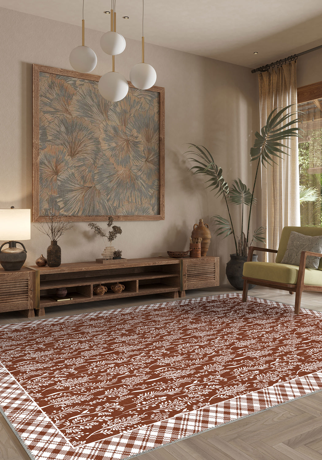 Encased in a softly structured checkered border, the overall design is a sweet nod to countryside textiles, echoing the feel of a hand-stitched quilt or a well-loved tablecloth. There’s a quiet poetry to this rug—something you can almost feel underfoot. And yes, it’s washable, making it just as practical as it is pretty.