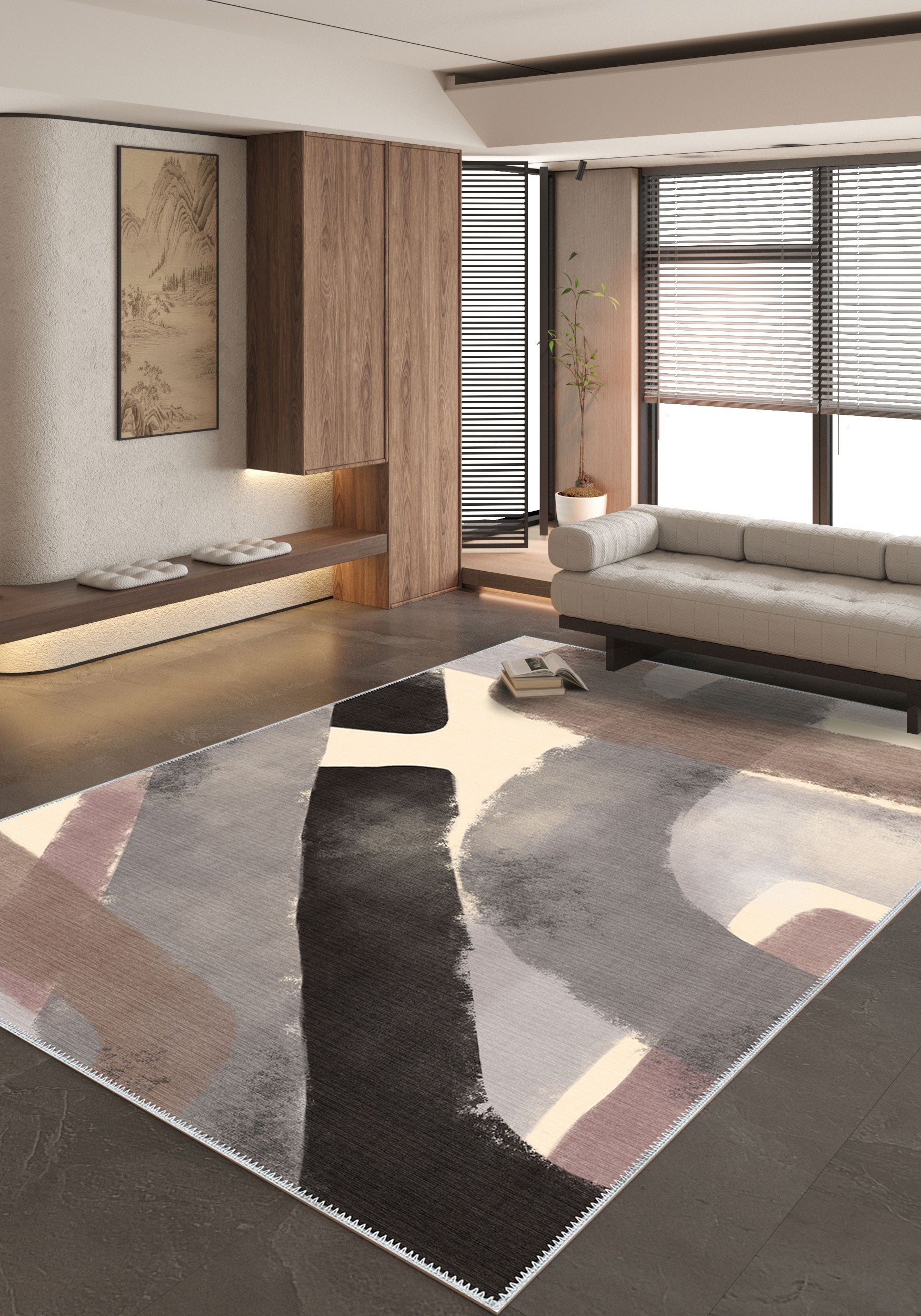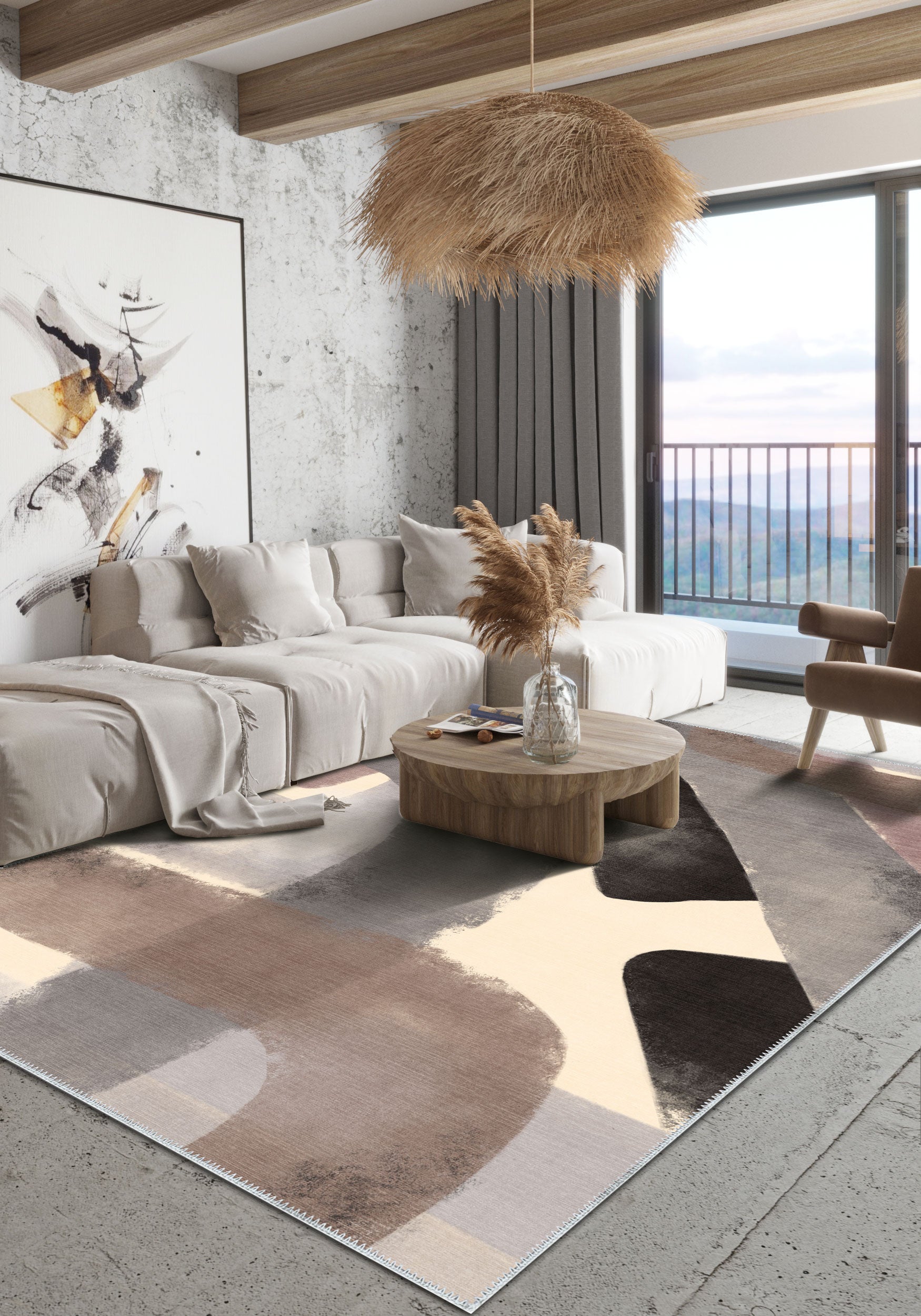 - Bedrooms: Add a calming yet artistic touch to your bedroom, where the neutral tones of this rug enhance a serene atmosphere while adding visual depth.