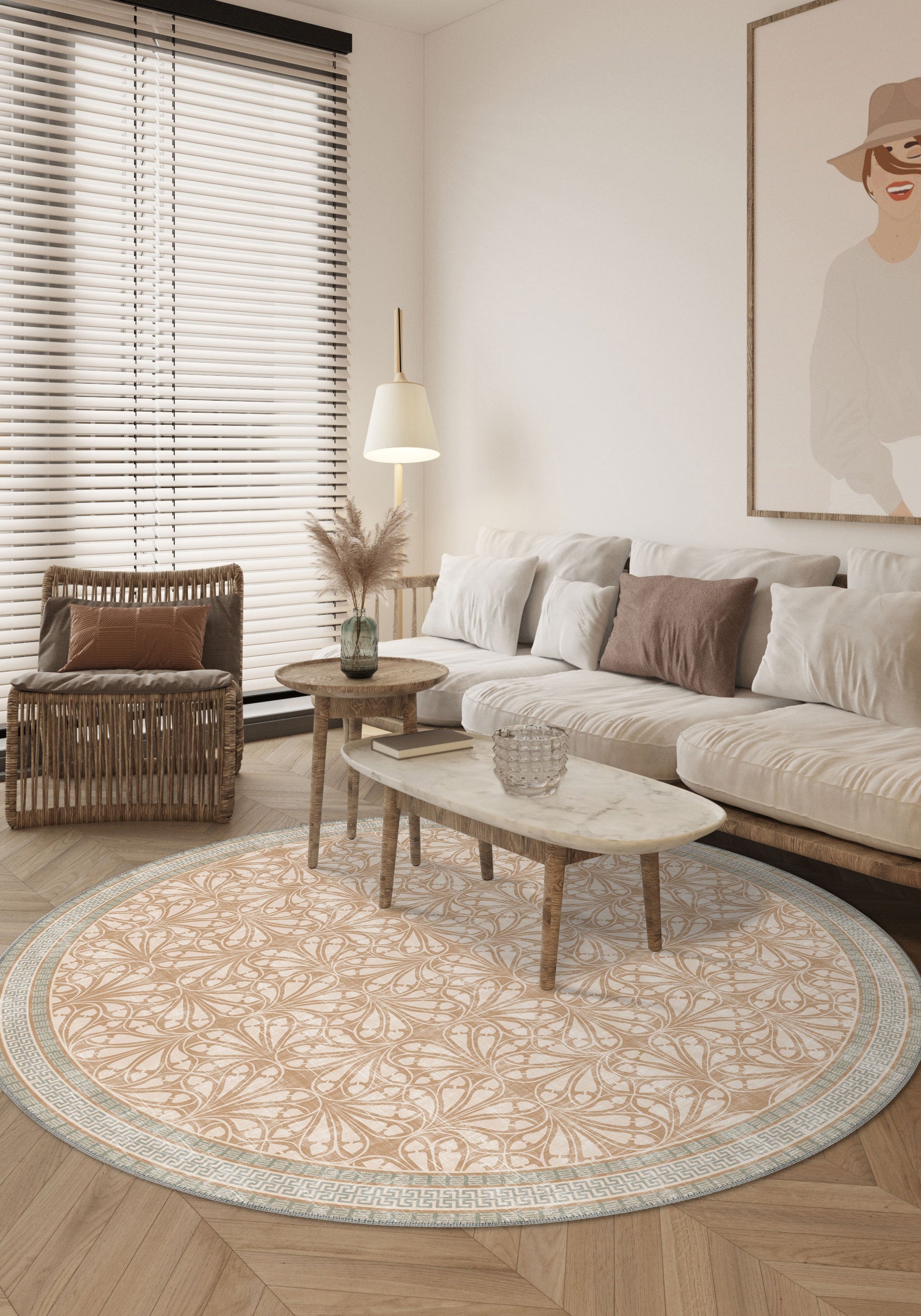 The Alexis Transitional Rug blends the best of traditional motifs with a modern flair. This beautiful rug features a delicate floral design framed by a striking Greek key border, creating a perfect balance of classic and contemporary. The warm beige and soft green tones bring an inviting feel, making it a versatile choice for any room in your home.