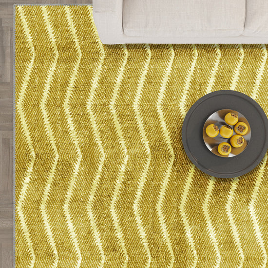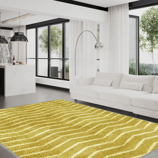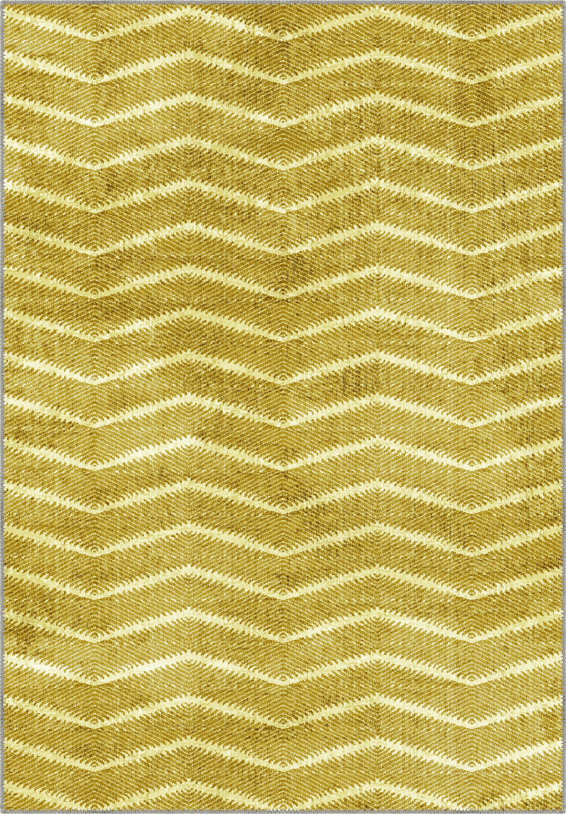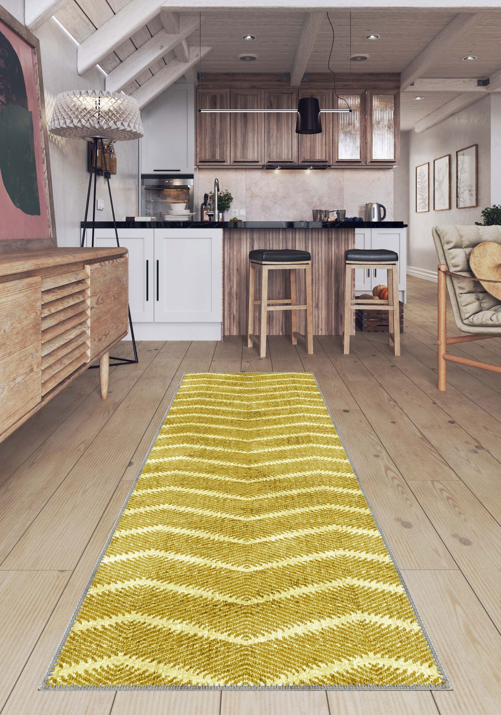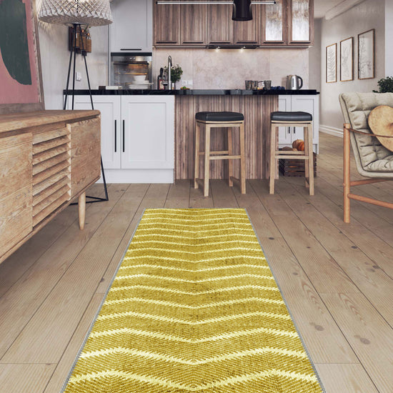 Make a bold statement with the Alice Yellow Modern Washable Rug. Featuring a vibrant yellow color and a chic zigzag pattern, this rug brings warmth and energy to any space. With its modern design and practical washable feature, this rug is both stylish and easy to maintain, perfect for busy households.