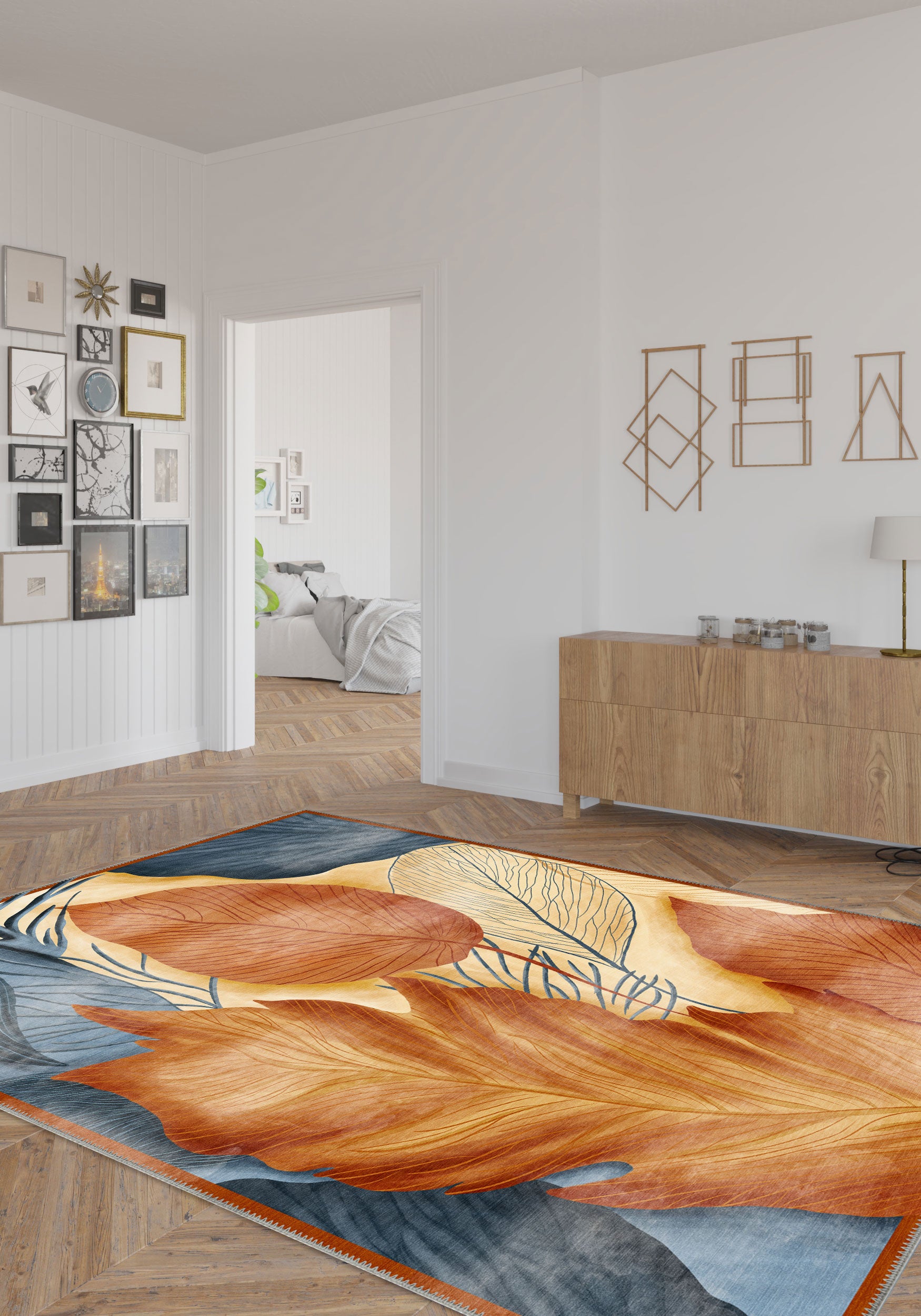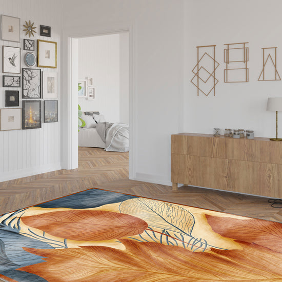 The Althea Orange Floral Rug is a beautiful mix of bold colors and nature-inspired design, featuring warm orange, deep blue, and soft yellow tones in an oversized leaf motif. Perfect for adding a touch of warmth and charm, this rug enlivens both living spaces and kids' rooms. Its earthy palette combined with artistic flair makes it an ideal choice for modern, cozy, and playful interiors, effortlessly blending style with practicality.
