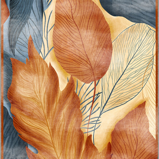 - Bold Leaf Motif: Large, whimsical leaves in rich orange, soft yellows, and deep blues create a playful yet elegant pattern that adds a nature-inspired, artistic touch to any room.