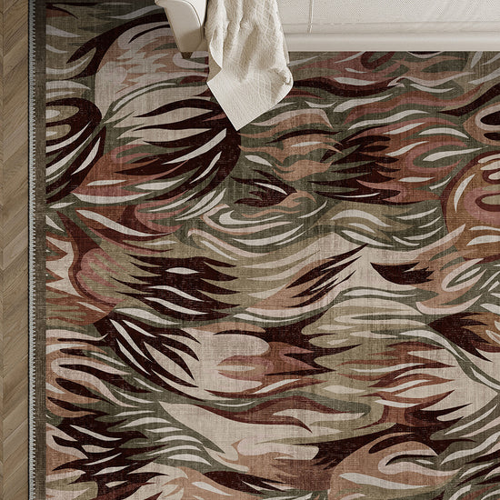 This contemporary rug is built around fluid, flame-like botanical forms that sweep across the surface in layered motion. The sage green base softens the composition, while terracotta and cocoa accents add warmth and quiet drama.