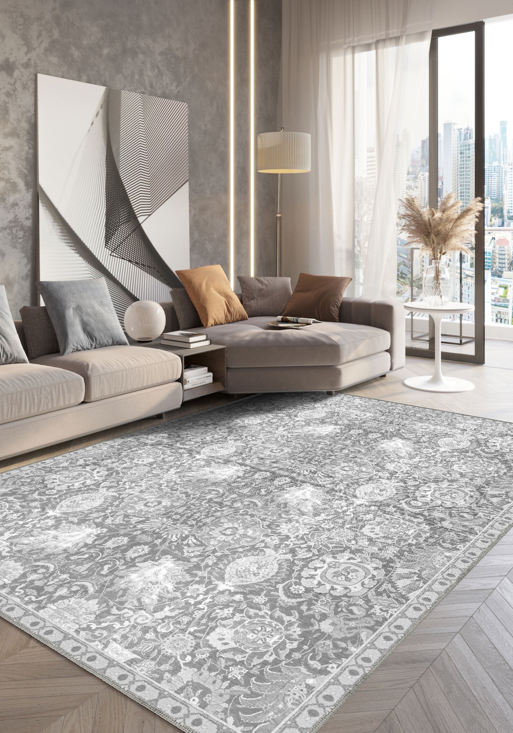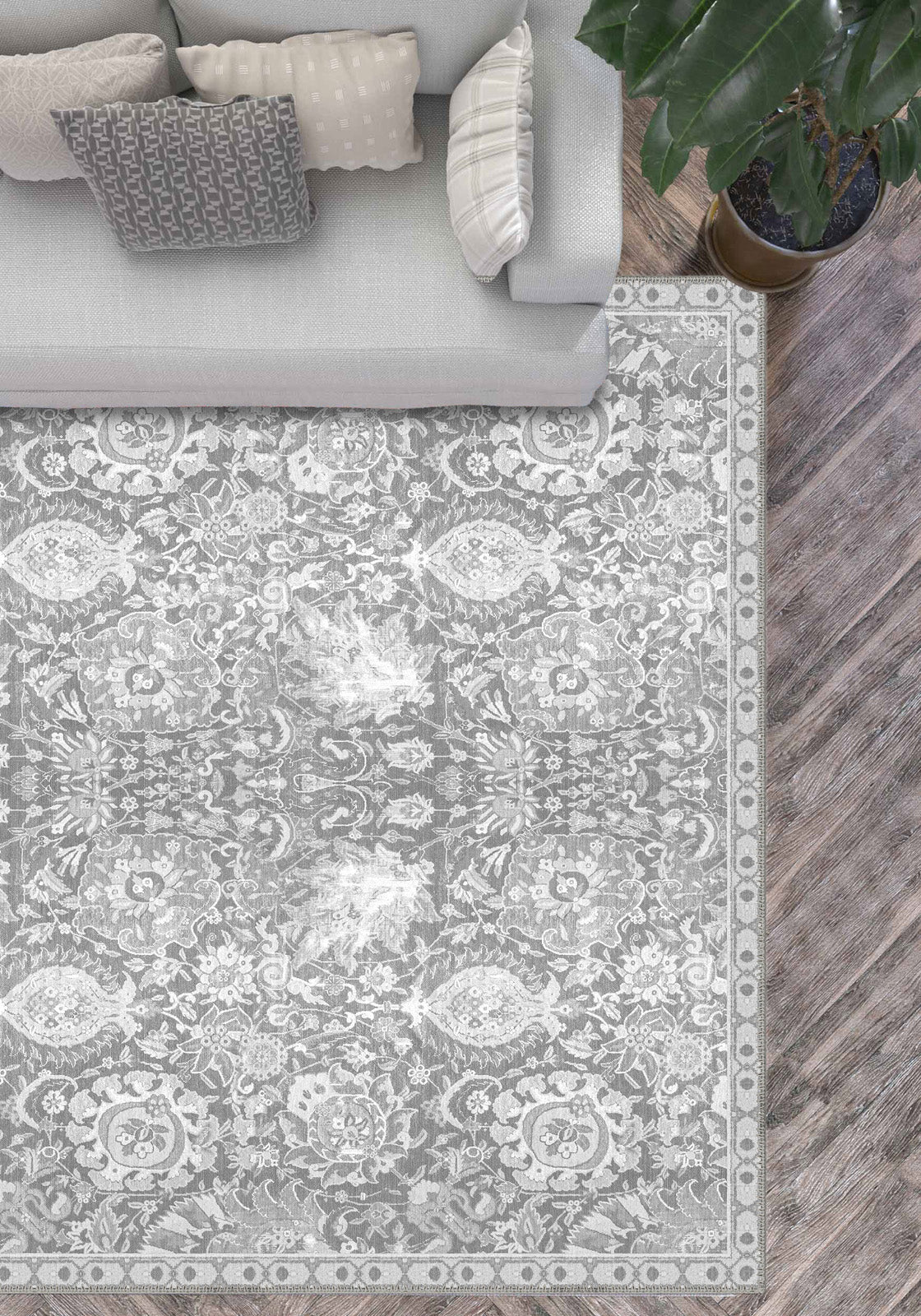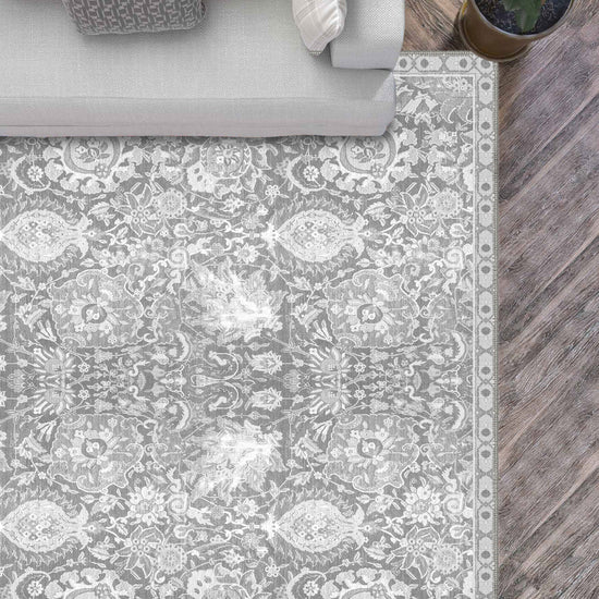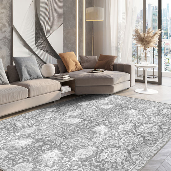 - Living Rooms: Elevate your living area with the rug’s subtle elegance, where its soft grey tones and vintage pattern bring a calming, luxurious feel.