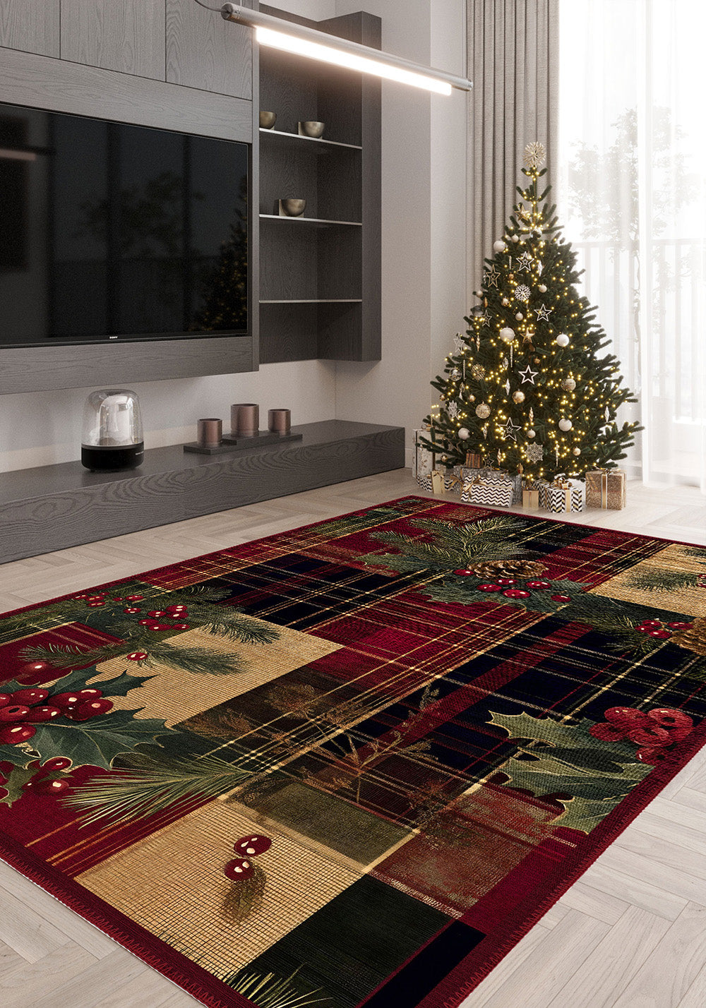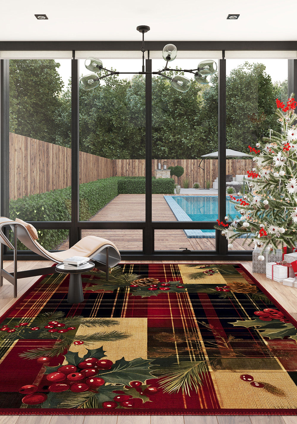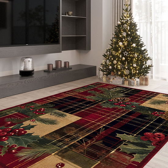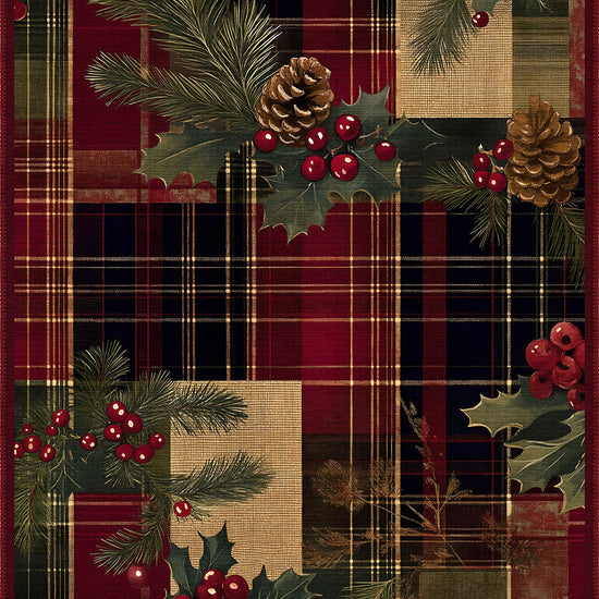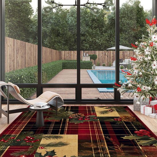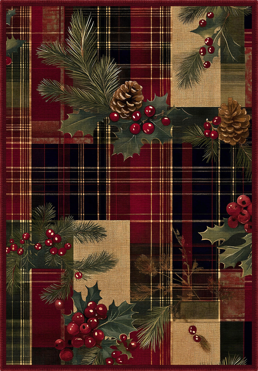 - Classic Plaid Design: This rug features a festive plaid pattern, enhanced by pinecones, holly, and berries, creating a rustic yet elegant holiday look.