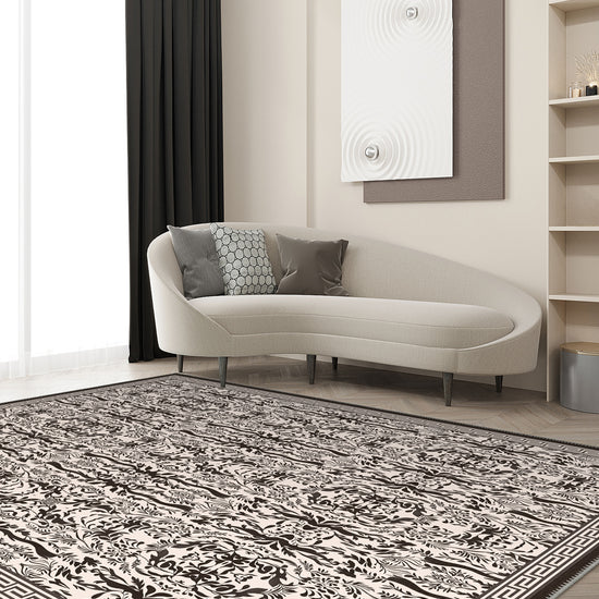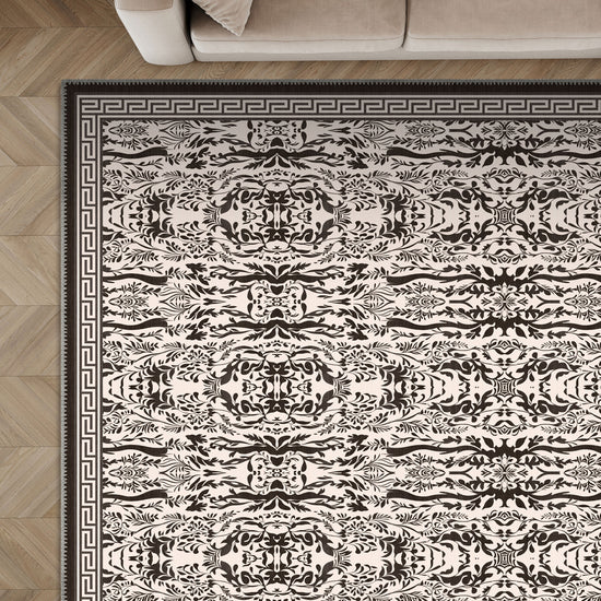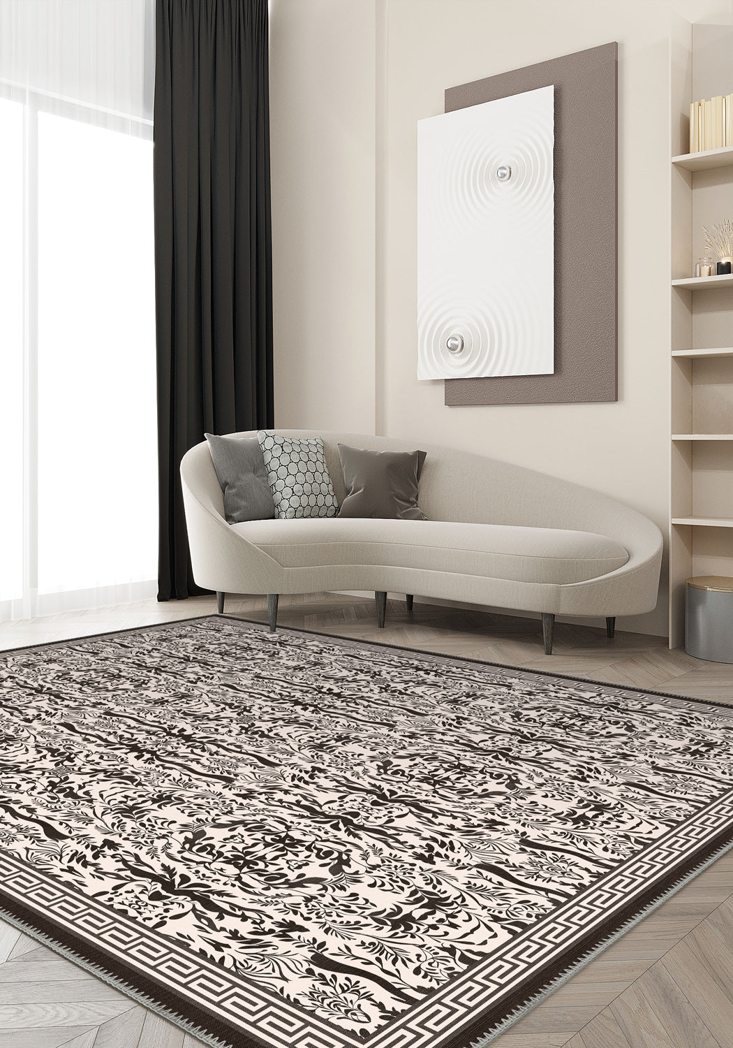 Grounded yet graceful, the Aveline Brown Damask Rug brings a warm sense of balance to any space. Its rich chocolate brown damask motifs are delicately layered over a soft sand-beige background, creating a warm contrast that feels both timeless and comforting. The intricate foliage-inspired pattern plays across the surface like vintage wallpaper, while the Grecian border adds a tailored architectural finish. A perfect mix of rustic softness and classic sophistication.