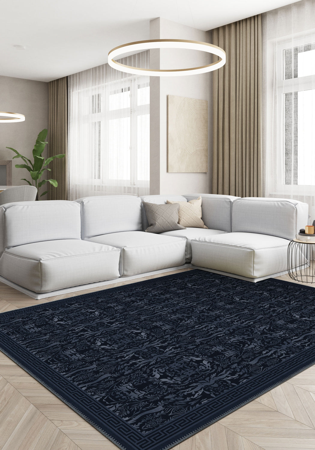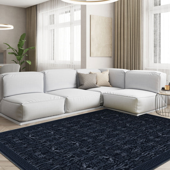 If elegance had a quiet voice, it would speak in the language of the Aveline Deep Navy Damask Rug. Cloaked in velvety layers of inky blue, this piece is a masterclass in tonal texture. The damask pattern emerges subtly, like candlelight flickering across silk wallpaper—ornamental, mysterious, and impossibly chic. A fine Grecian-inspired border frames the composition, completing the look with a sense of quiet confidence.
