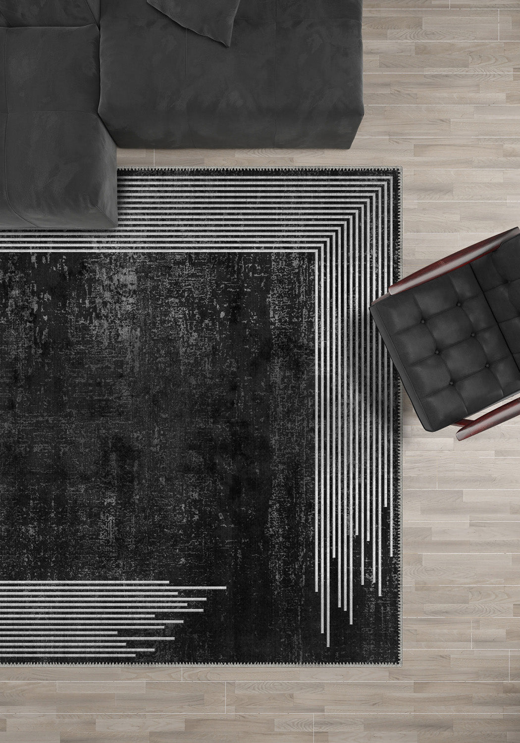 The Ayden Black and White Bordered Rug combines simplicity with a modern edge. Its striking black background contrasts beautifully with clean white linear borders, offering a contemporary design that suits minimalist and modern homes alike. This rug effortlessly enhances any space with its bold, sleek look, creating a dramatic focal point.