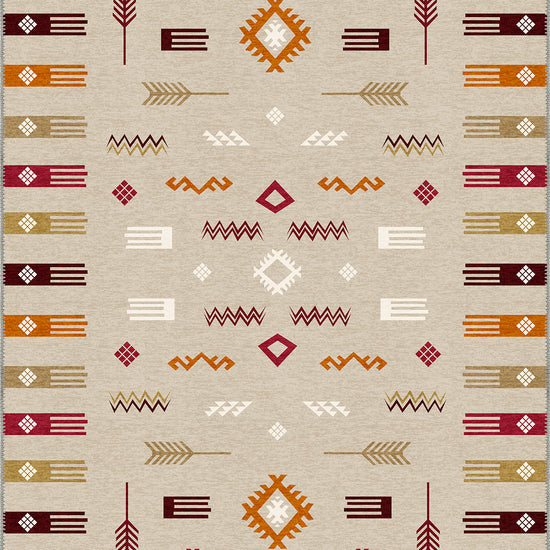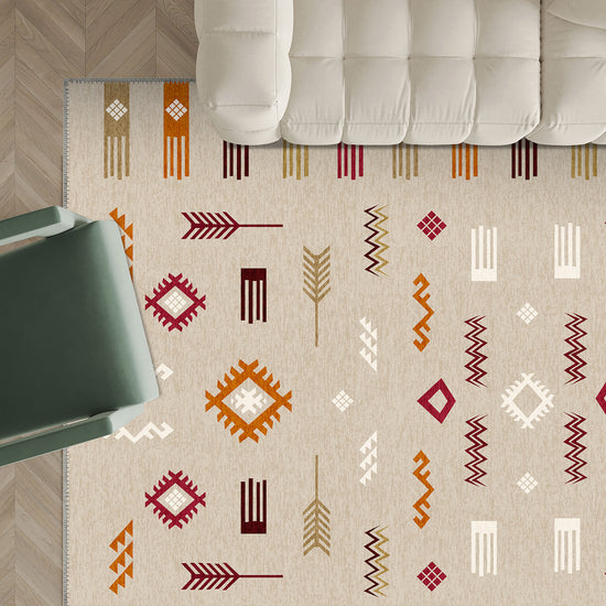 The Azra Beige Berber Rug draws on centuries of Moroccan tradition, reimagining tribal symbols with a modern spirit. Its warm beige base is scattered with joyful Berber motifs—diamonds, arrows, zigzags—in rich earthy tones like ochre, rust, burgundy and ivory. A contemporary twist on the classic Moroccan rug, perfect for interiors that crave soul and softness.