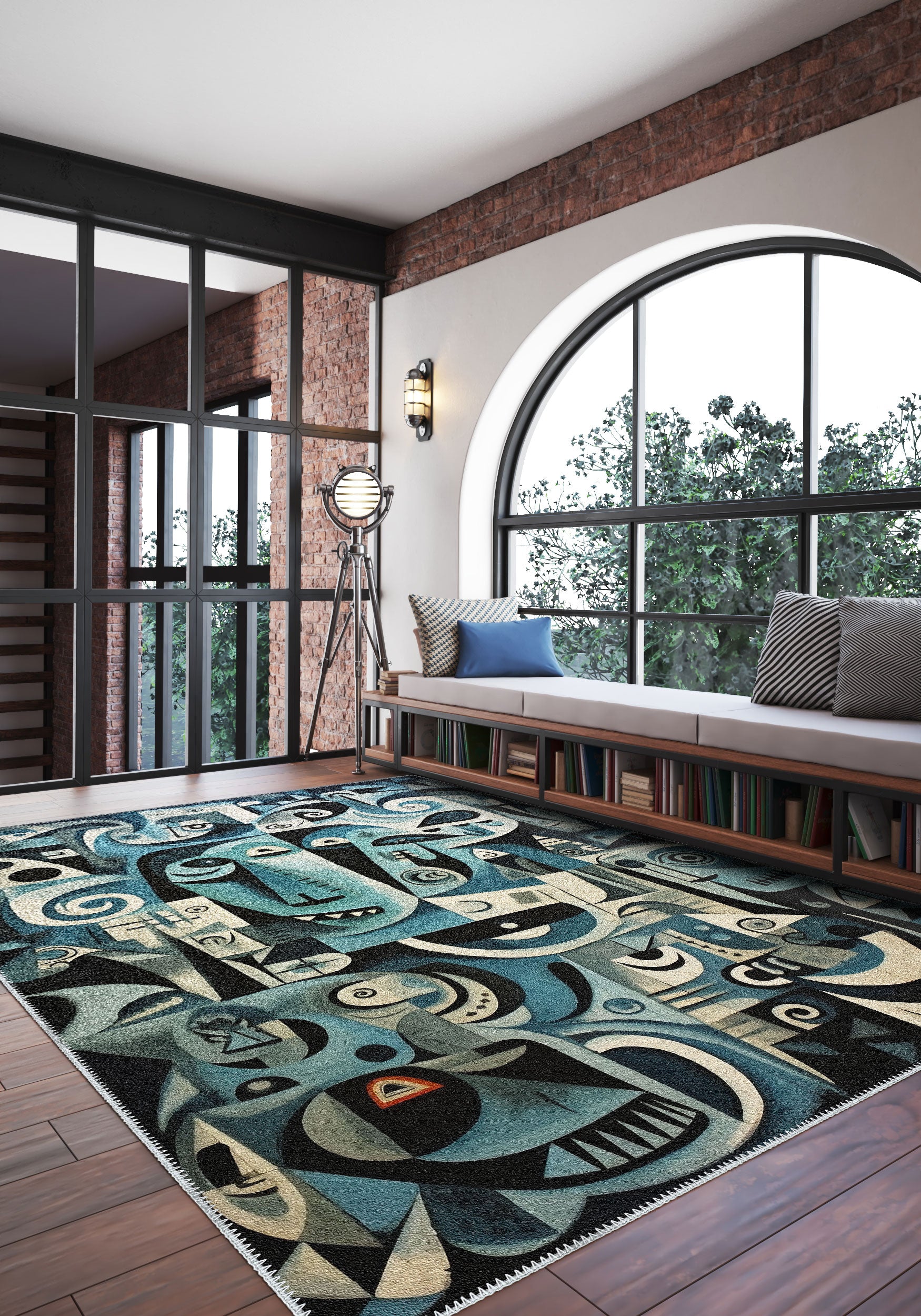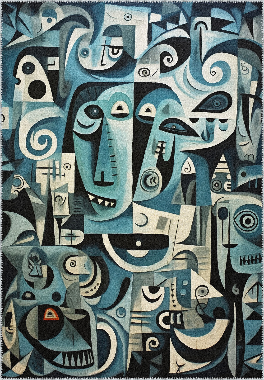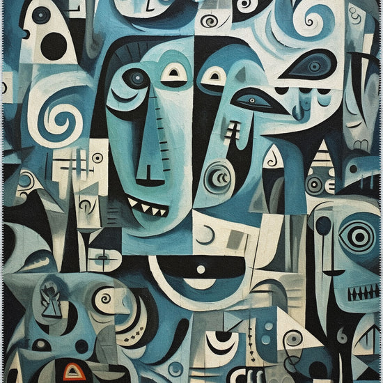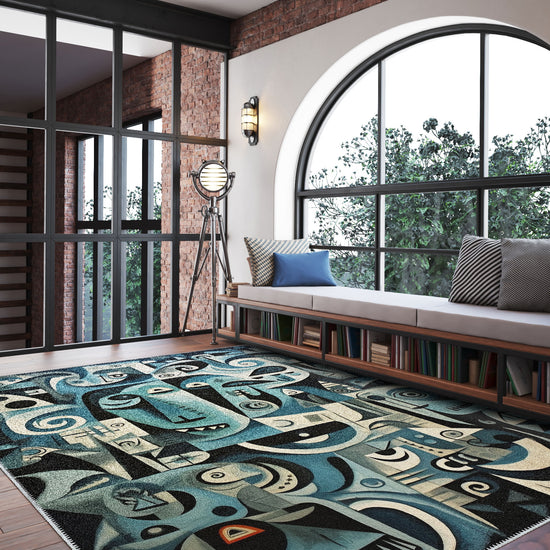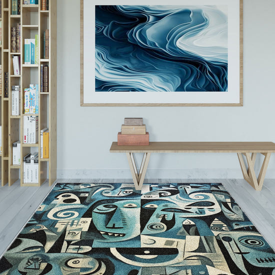 - Abstract Geometric Design: Featuring an intricate mix of abstract faces, geometric shapes, and swirling lines, this rug evokes a sense of modern art and creativity.