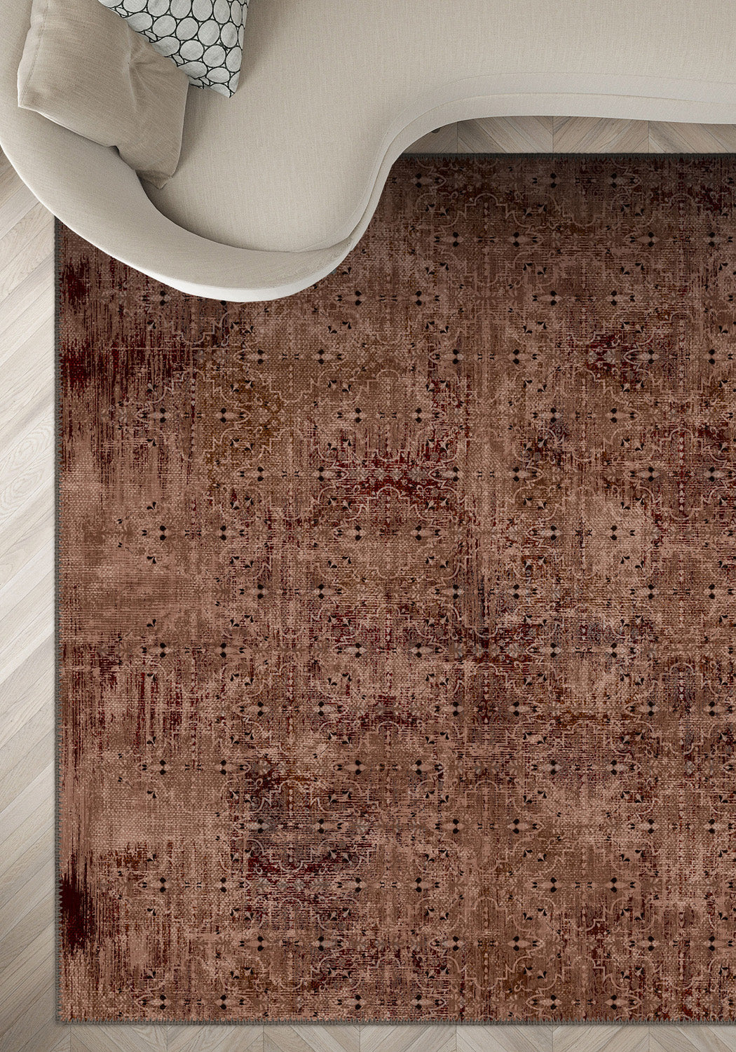 Designed for effortless living, this rug is machine washable, ensuring easy upkeep while maintaining its elegant, aged appearance. Its low-pile texture is durable, hypoallergenic, and dust-free, making it a practical yet stylish addition to busy homes.