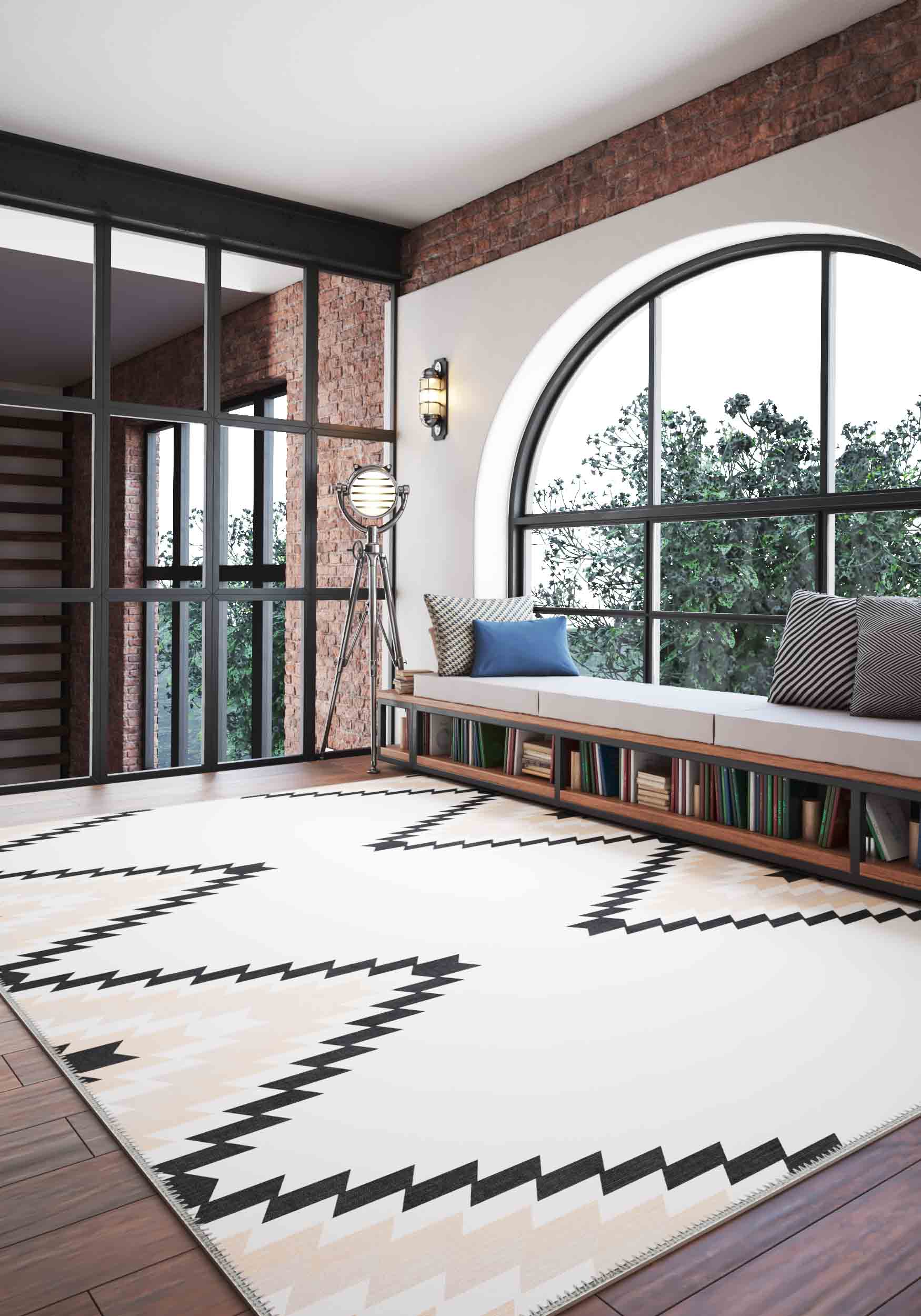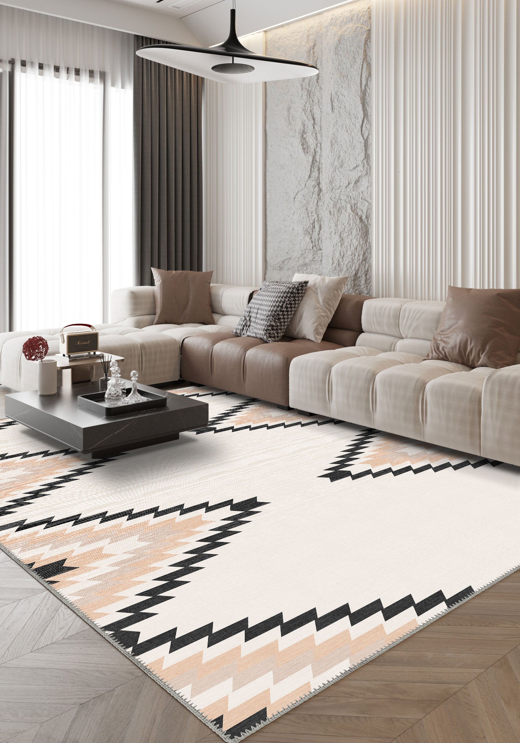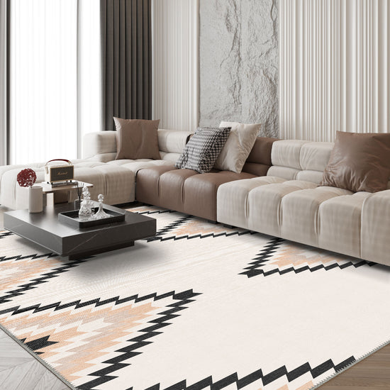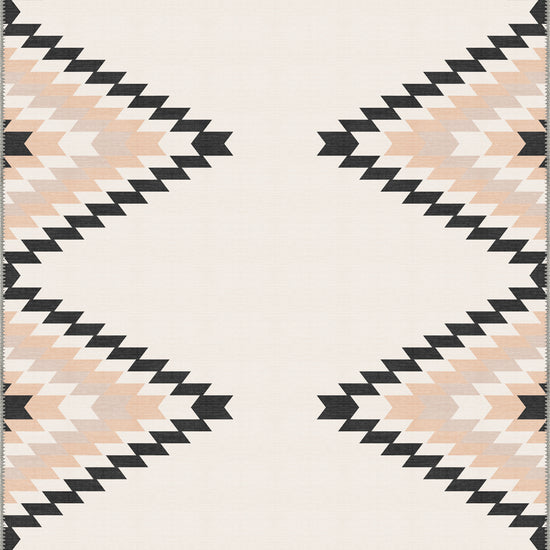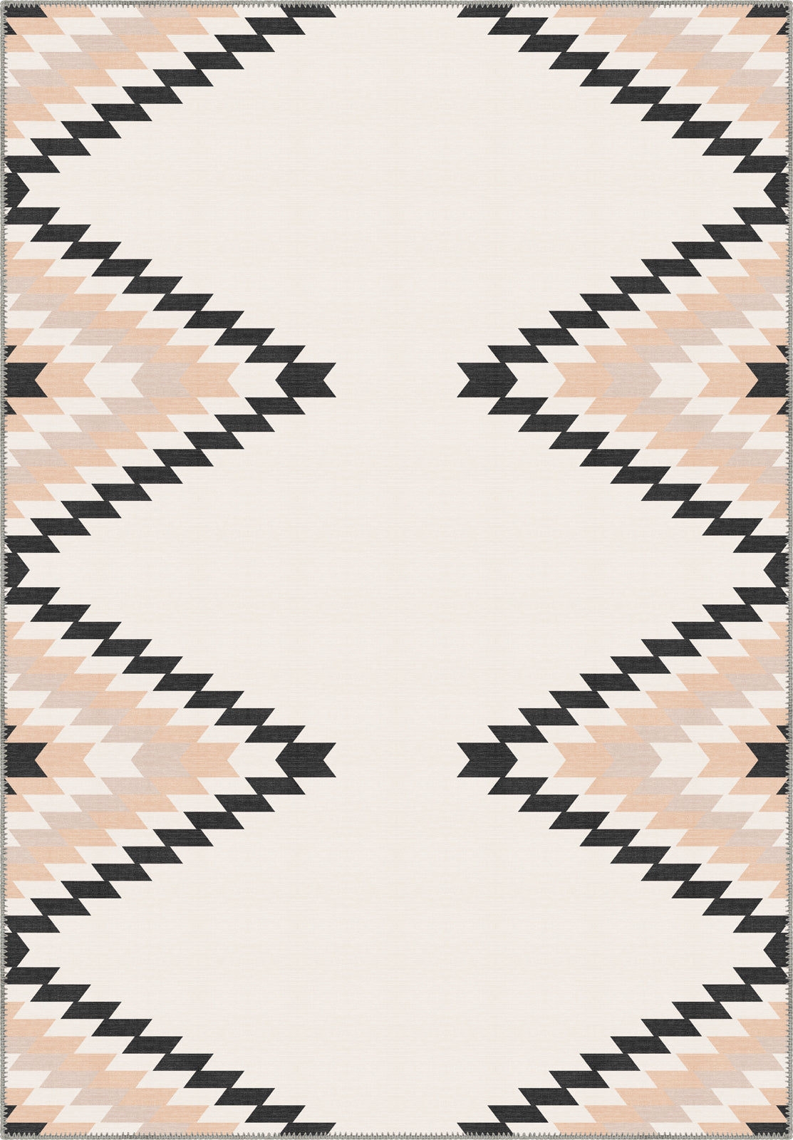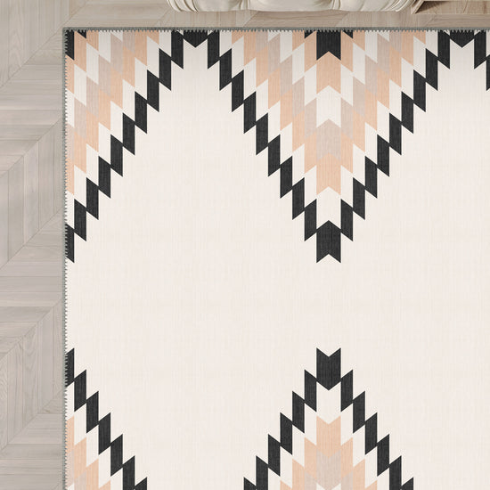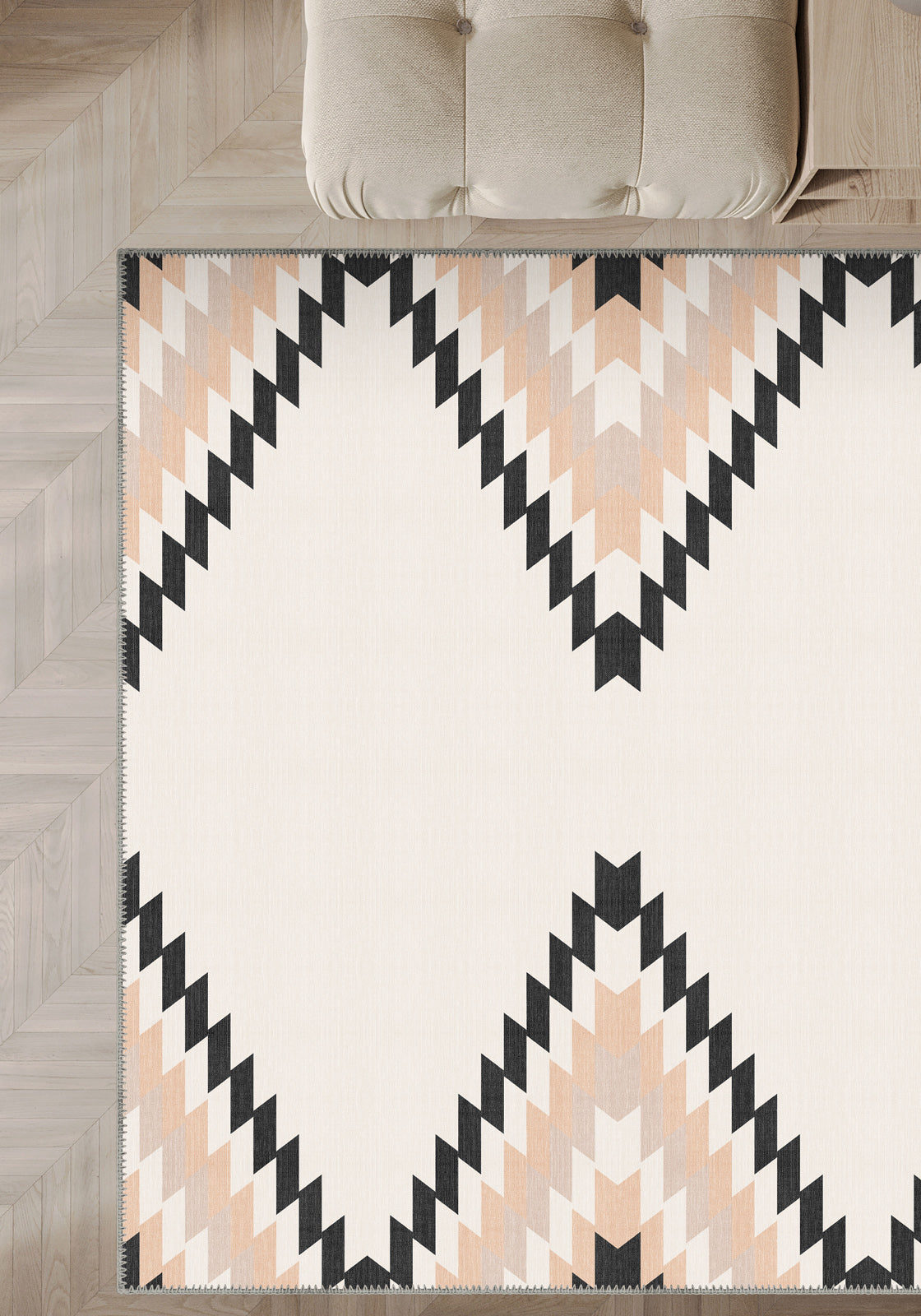 The Cadmus Cream Washable Rug merges sleek minimalism with bold geometric patterns, offering a fresh, modern addition to your home decor. The neutral cream background is beautifully contrasted by striking black and soft peach zigzag patterns, creating a visually dynamic yet refined design. This washable rug is perfect for those who want both style and convenience, making it a practical choice for high-traffic areas.