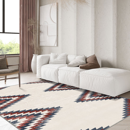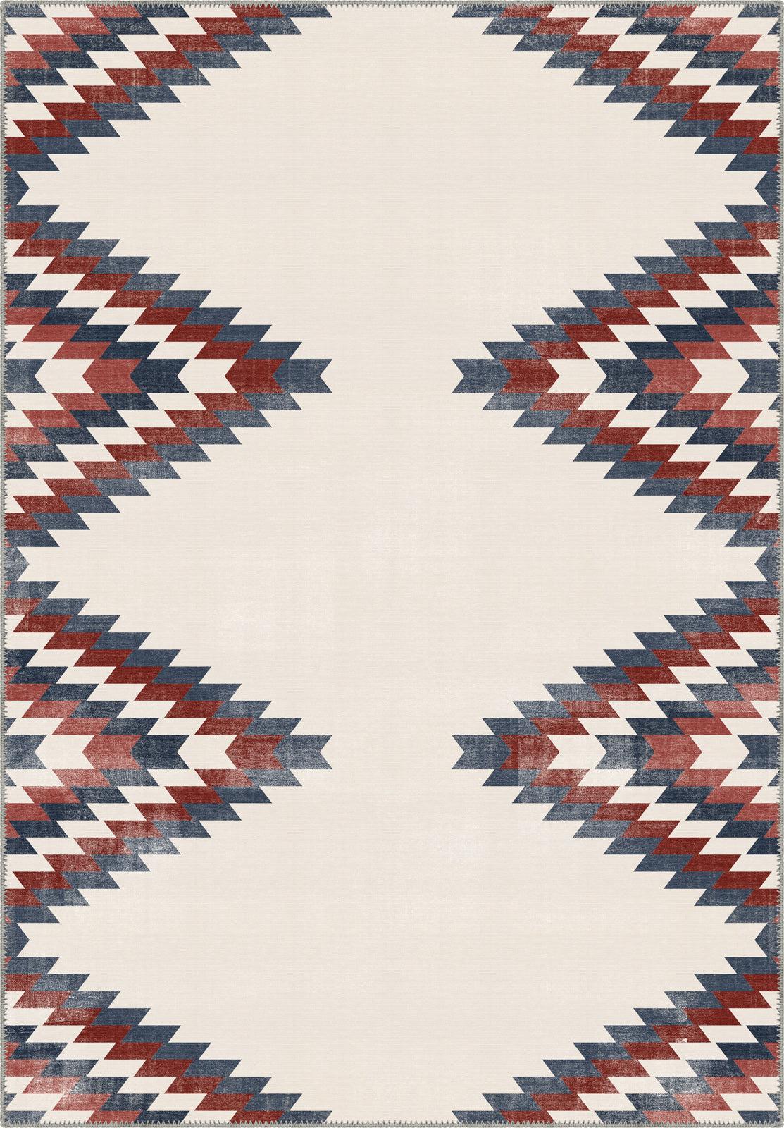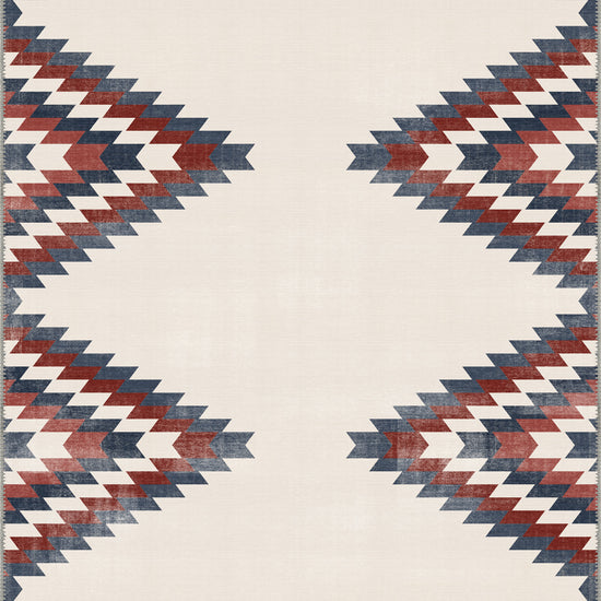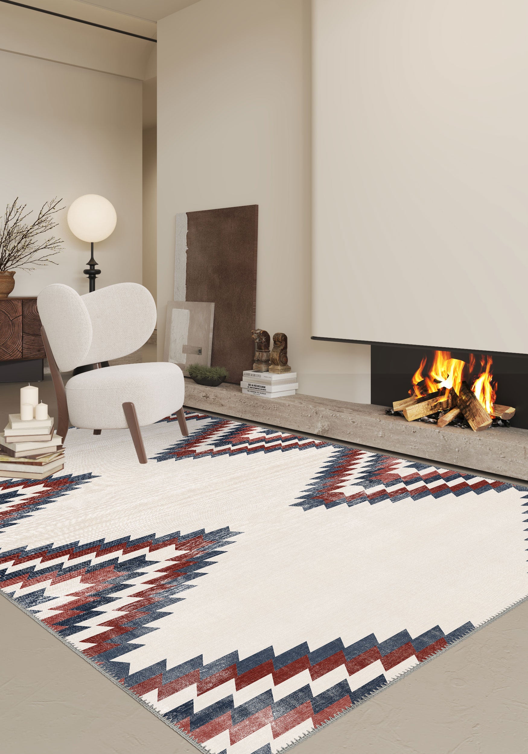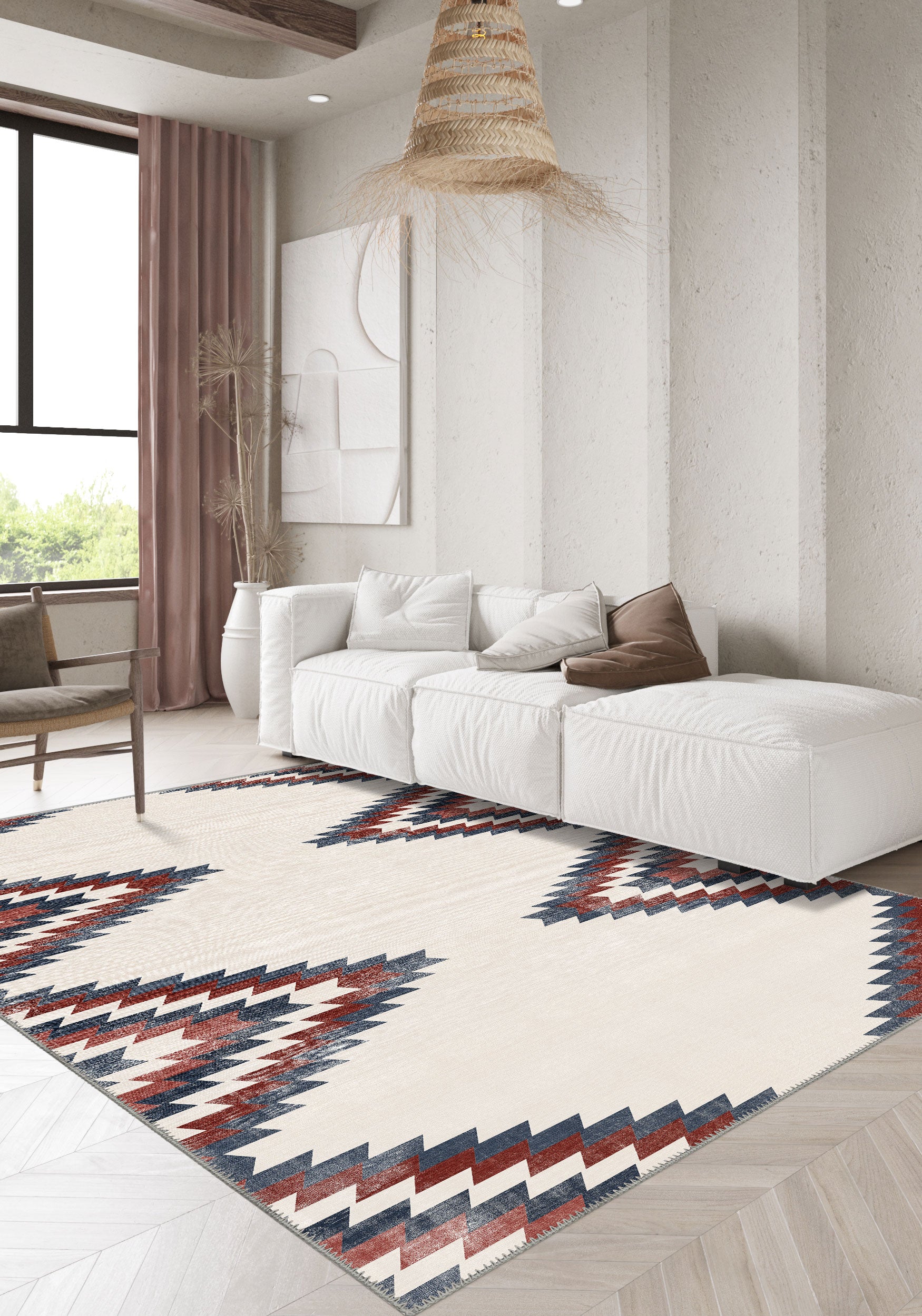 The Cadmus Geometric Modern Rug brings bold, vibrant colors and striking geometric patterns together for a contemporary yet timeless design. Featuring a dynamic zigzag pattern in deep red, navy, and cream, this rug is perfect for creating a visually captivating focal point in any room. Its combination of vibrant tones and structured design offers a modern look that complements a variety of interior styles.