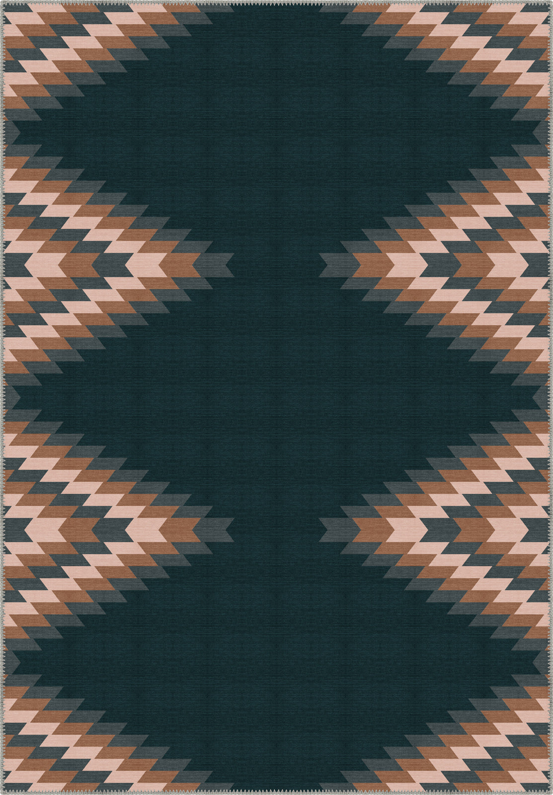 - Bedrooms: The deep teal and contrasting geometric patterns make this rug a cozy and stylish addition to bedrooms, creating a calm yet vibrant atmosphere.