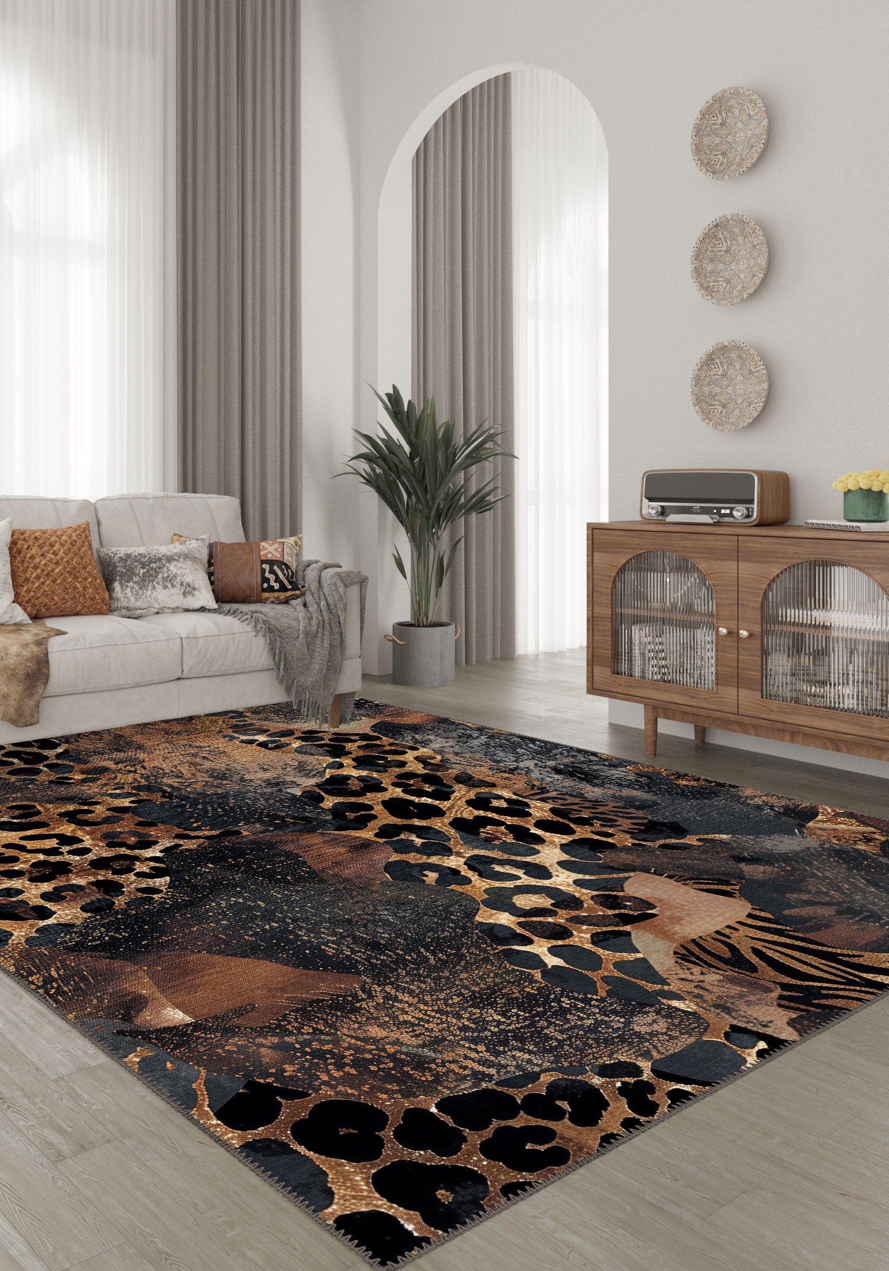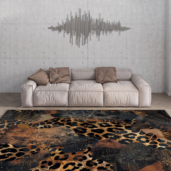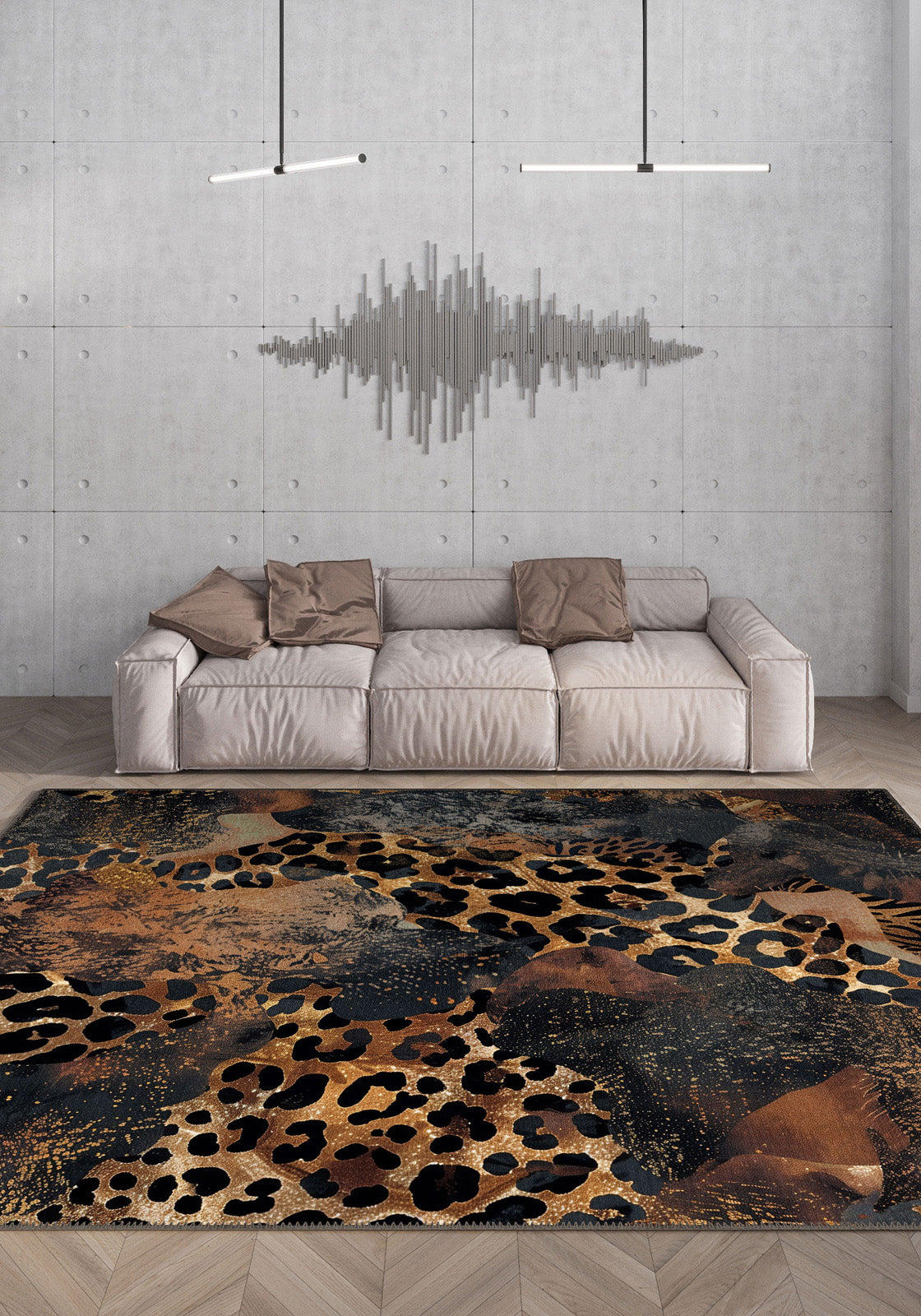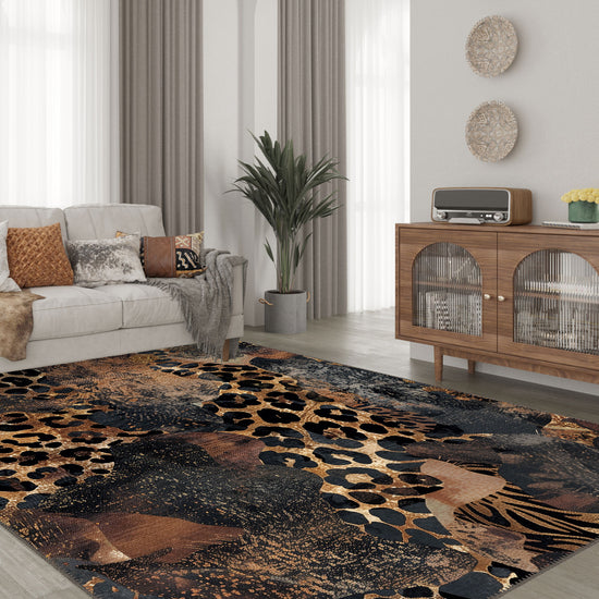 - Exotic Animal Print: A mix of leopard and tiger prints in warm brown and black tones gives this rug a fierce and fashionable appeal.