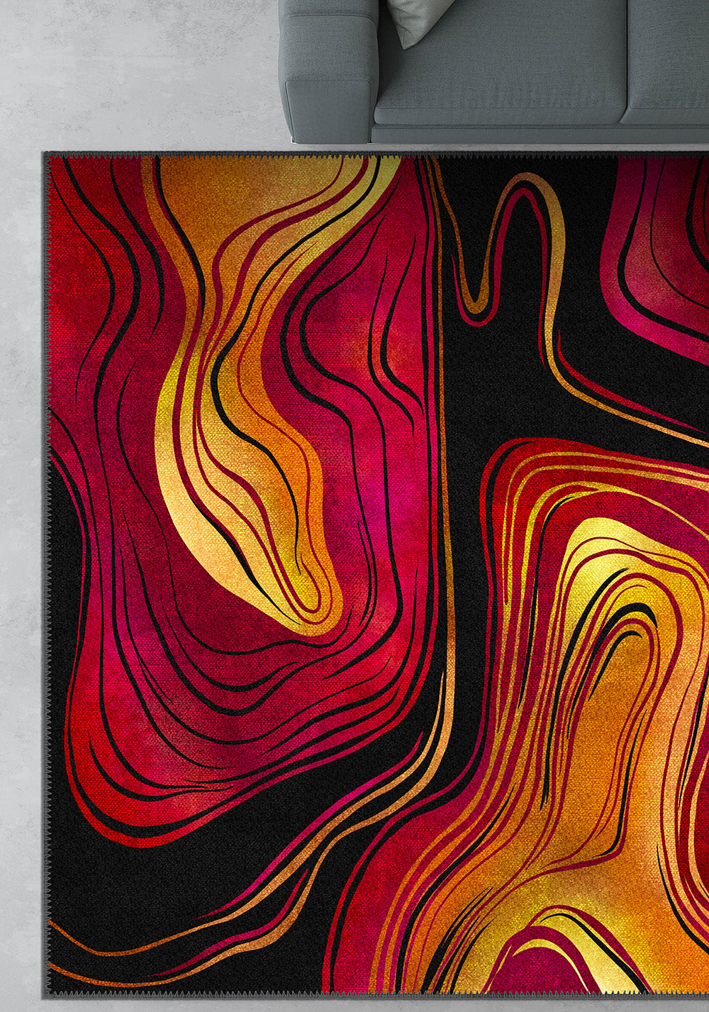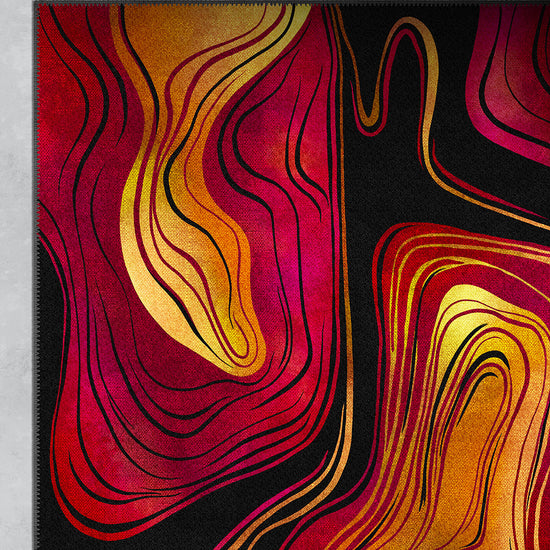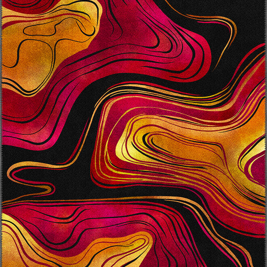 The Calida Abstract Lava Rug turns up the heat—literally and stylistically. With rich swirls of crimson, gold, orange, and fuchsia flowing over a deep black canvas, this rug is a visual eruption of energy and emotion. Its fluid, topographic lines mimic the natural flow of lava, bringing fire, passion, and movement into your interior story.