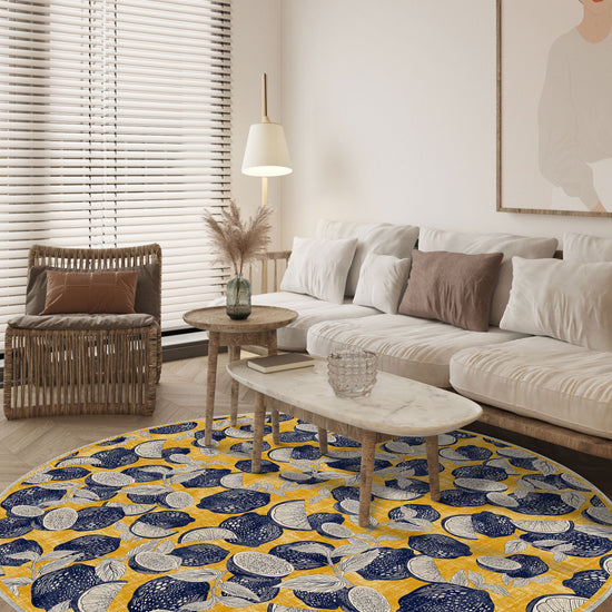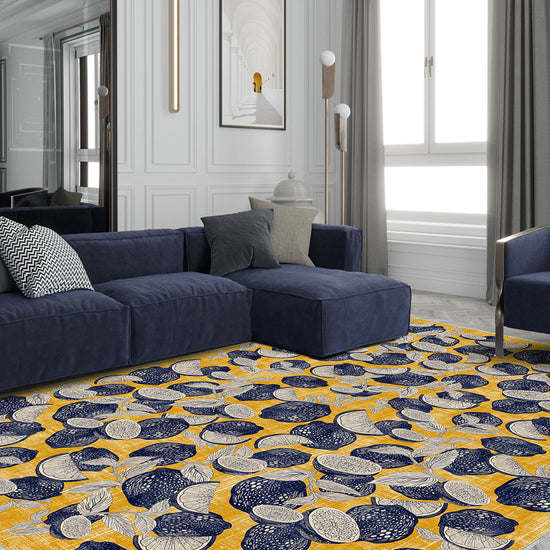 Brighten up your space with the refreshing energy of the Capri Yellow Citrus Rug. Featuring a playful and bold pattern of citrus fruits against a warm yellow background, this rug is perfect for adding a lively Mediterranean vibe to any room. The striking contrast of navy and white citrus designs against the sunny yellow backdrop creates a vibrant and cheerful atmosphere that brings a splash of sunshine indoors.