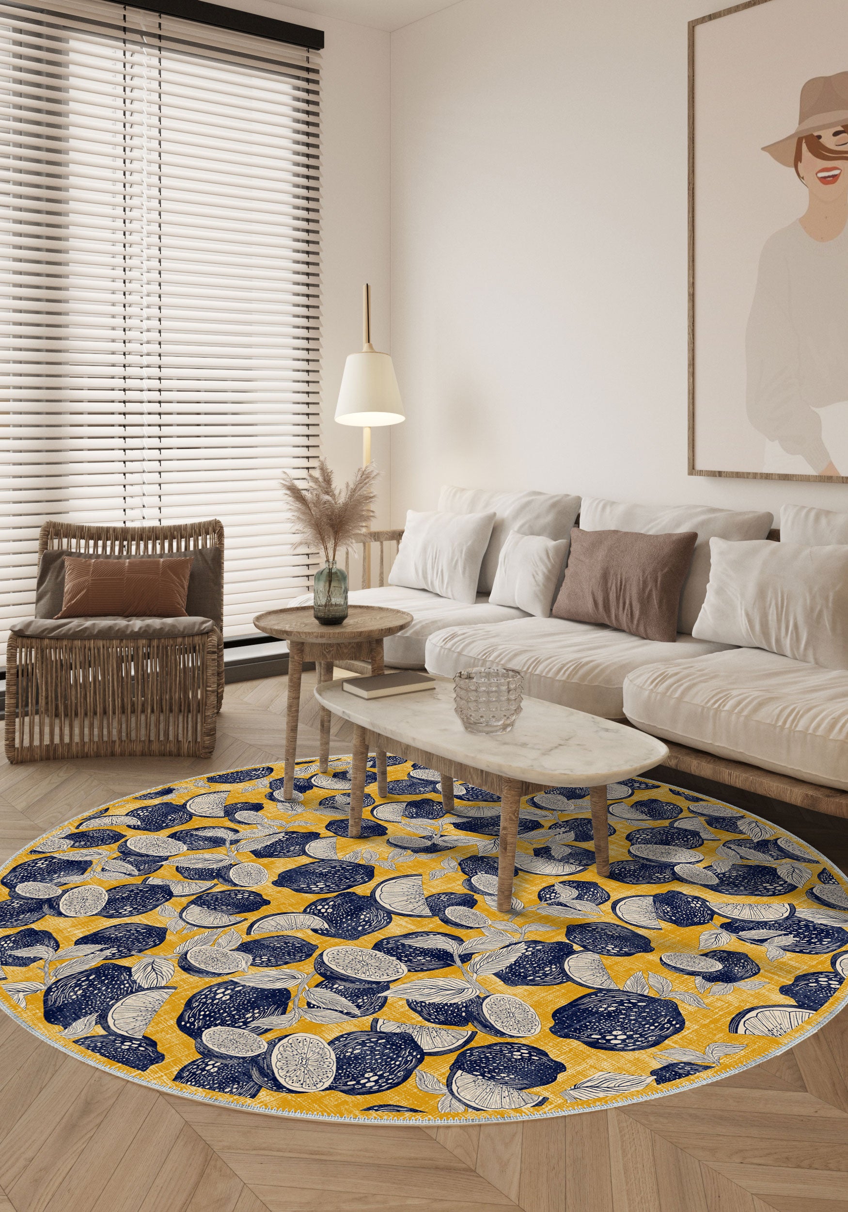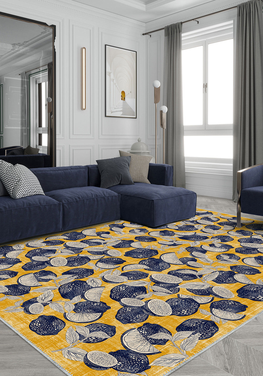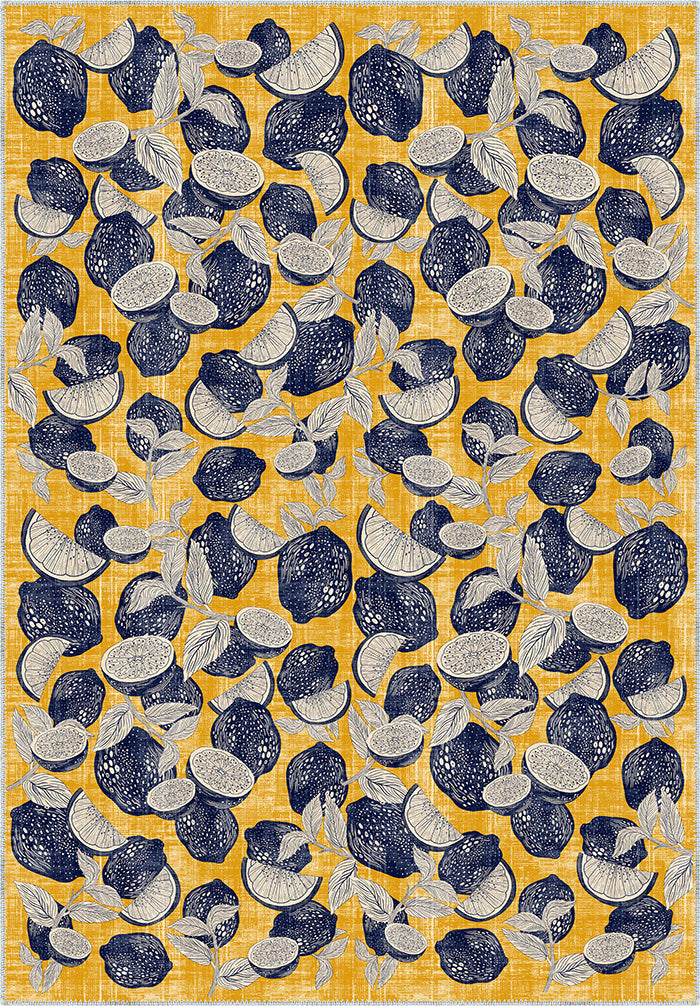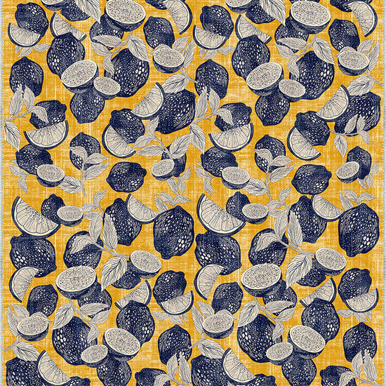 - Citrus-Inspired Print: A vibrant pattern of detailed citrus fruits in navy and white, scattered across a sunny yellow background, adds freshness and zest to your space.