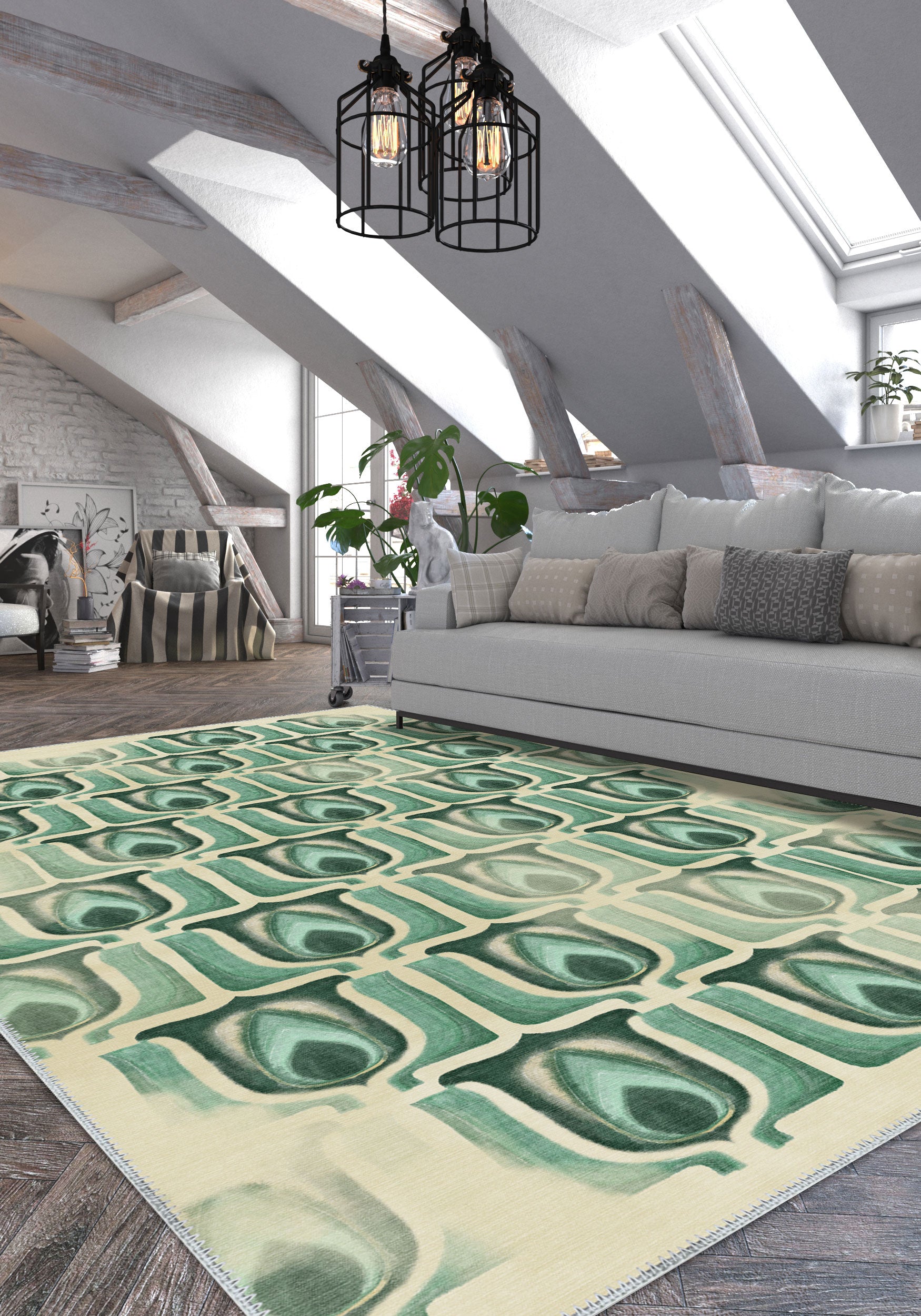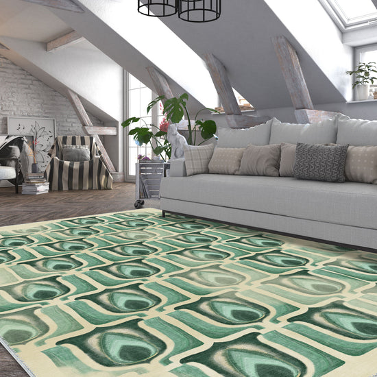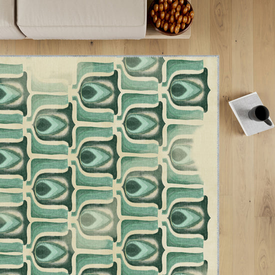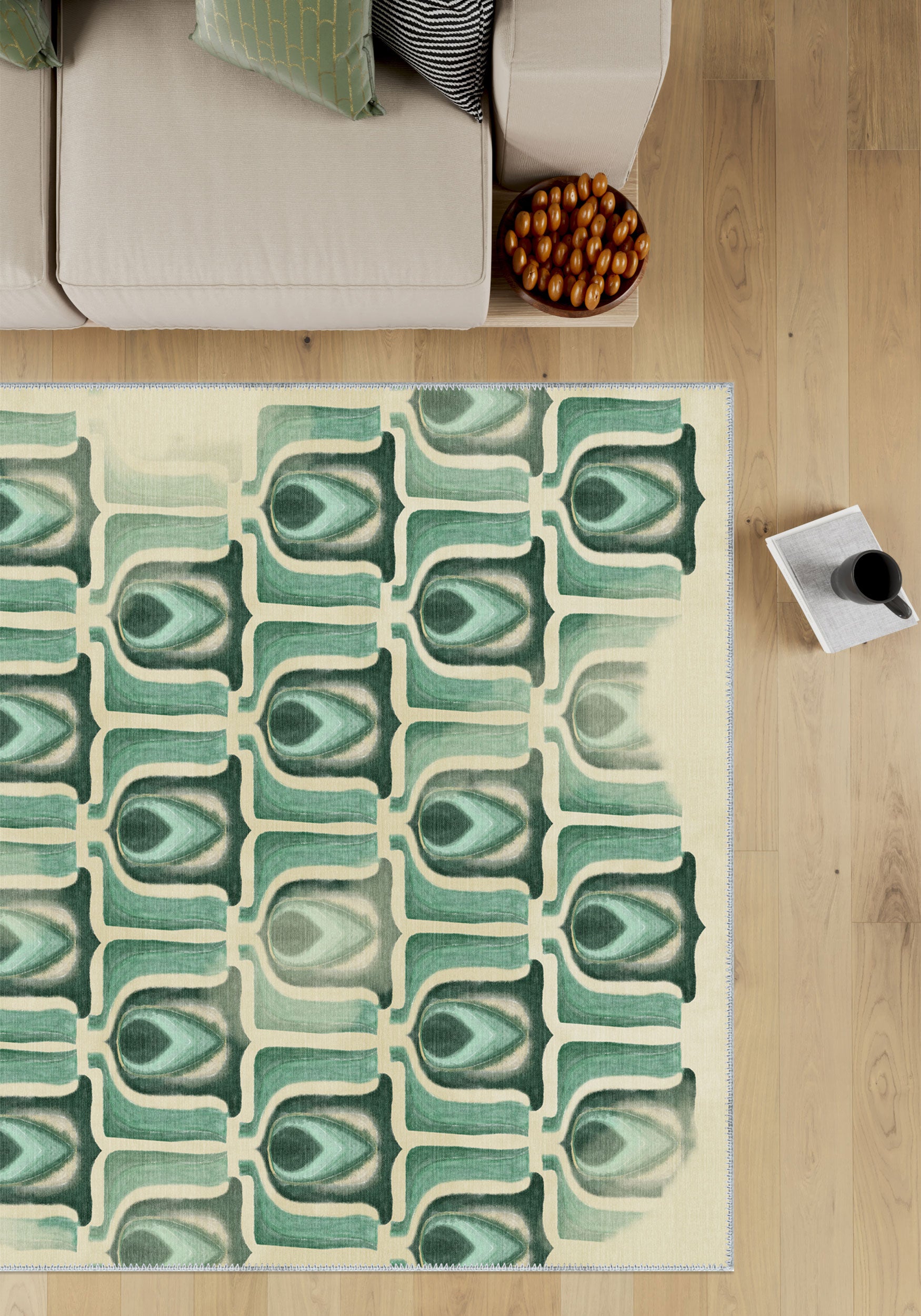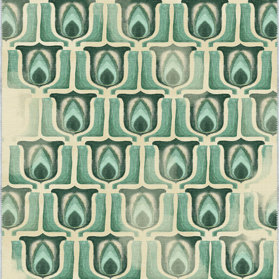 The Cleo Green Tulip Mid Century Modern Rug is an elegant fusion of tulip shapes and peacock feather-inspired motifs. This distinctive combination brings both floral softness and the majestic allure of peacock feathers, creating a pattern that is perfect for adding a unique, nature-inspired touch to your space.