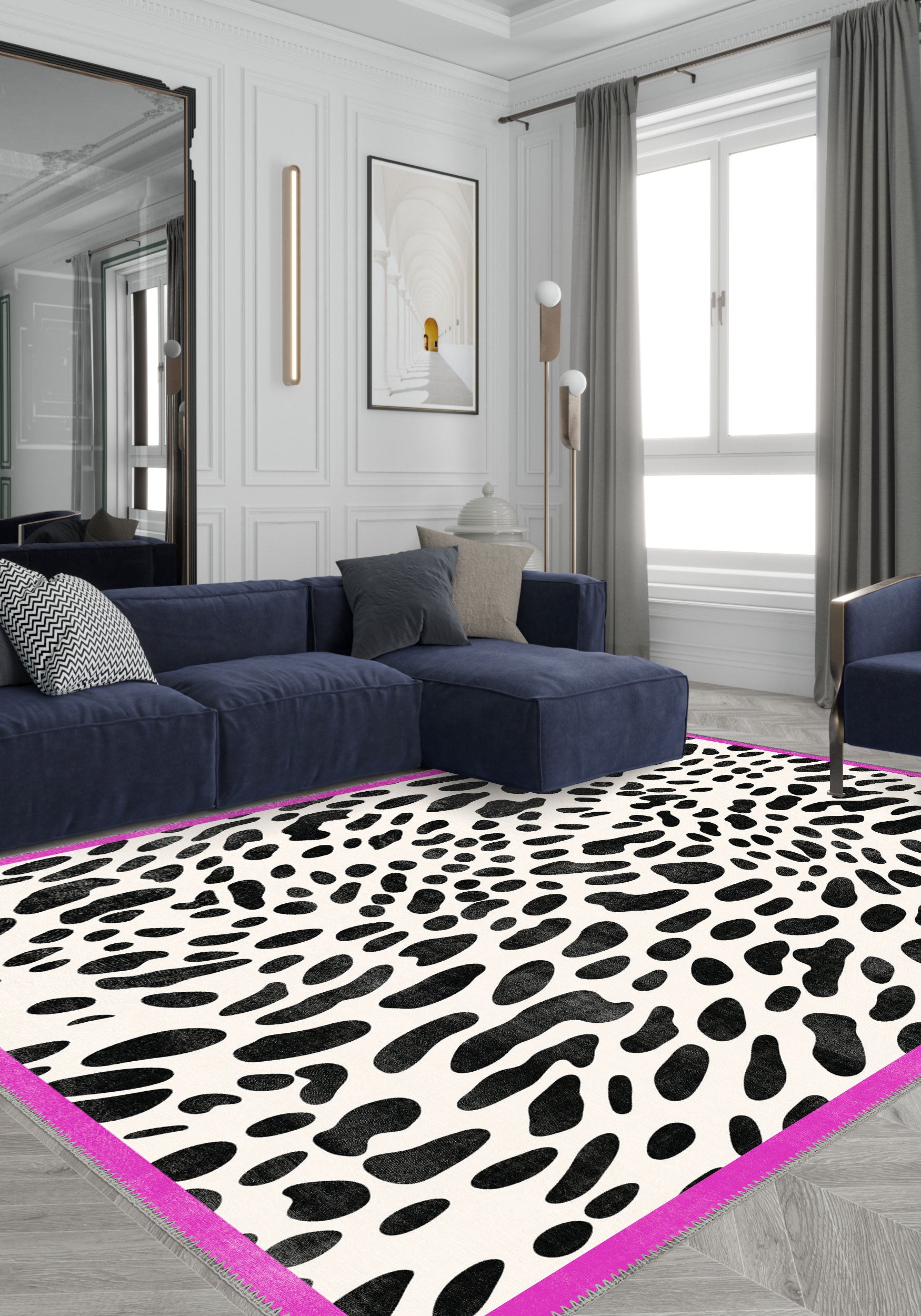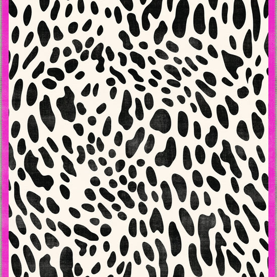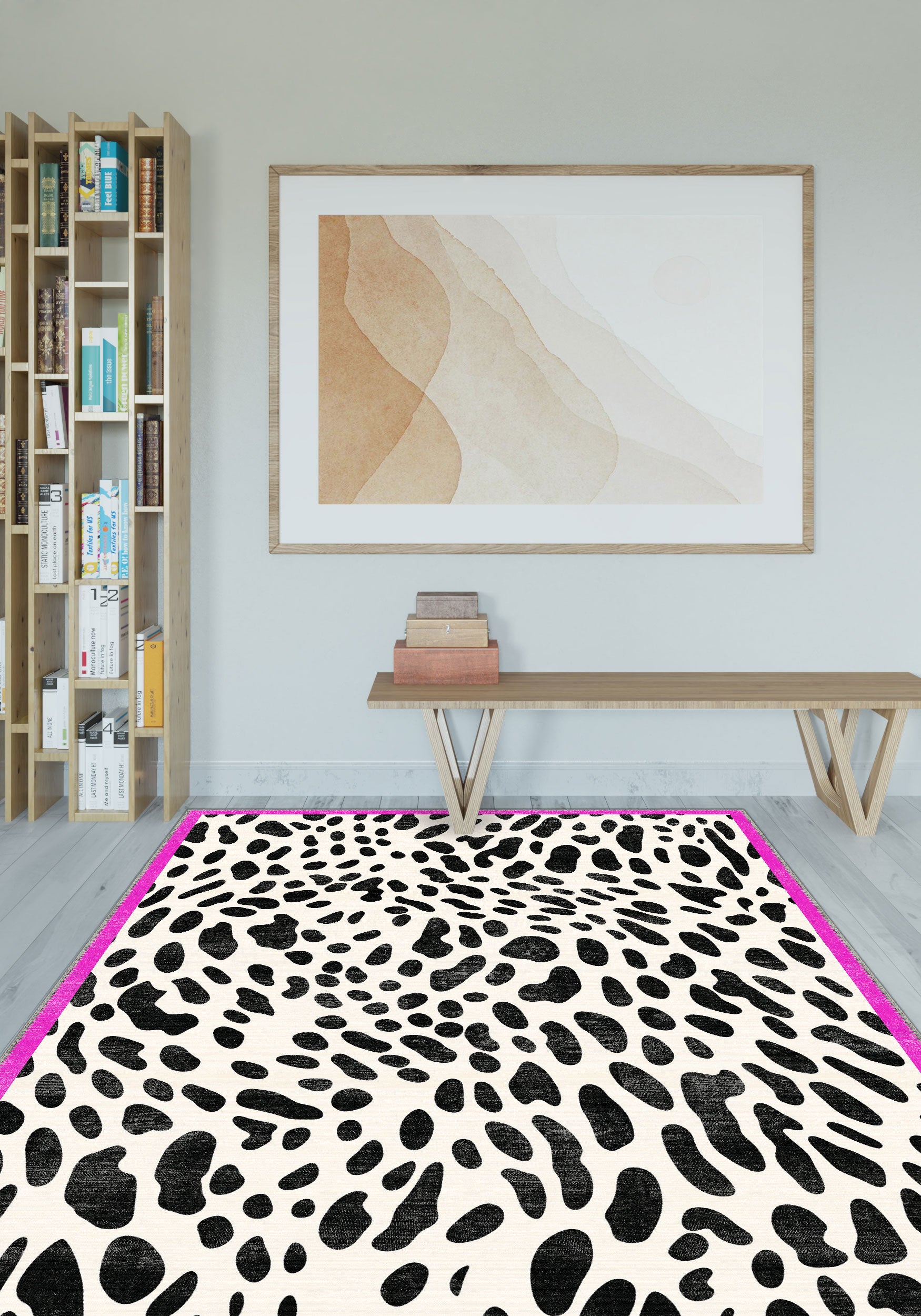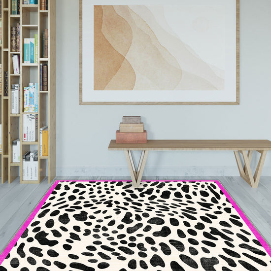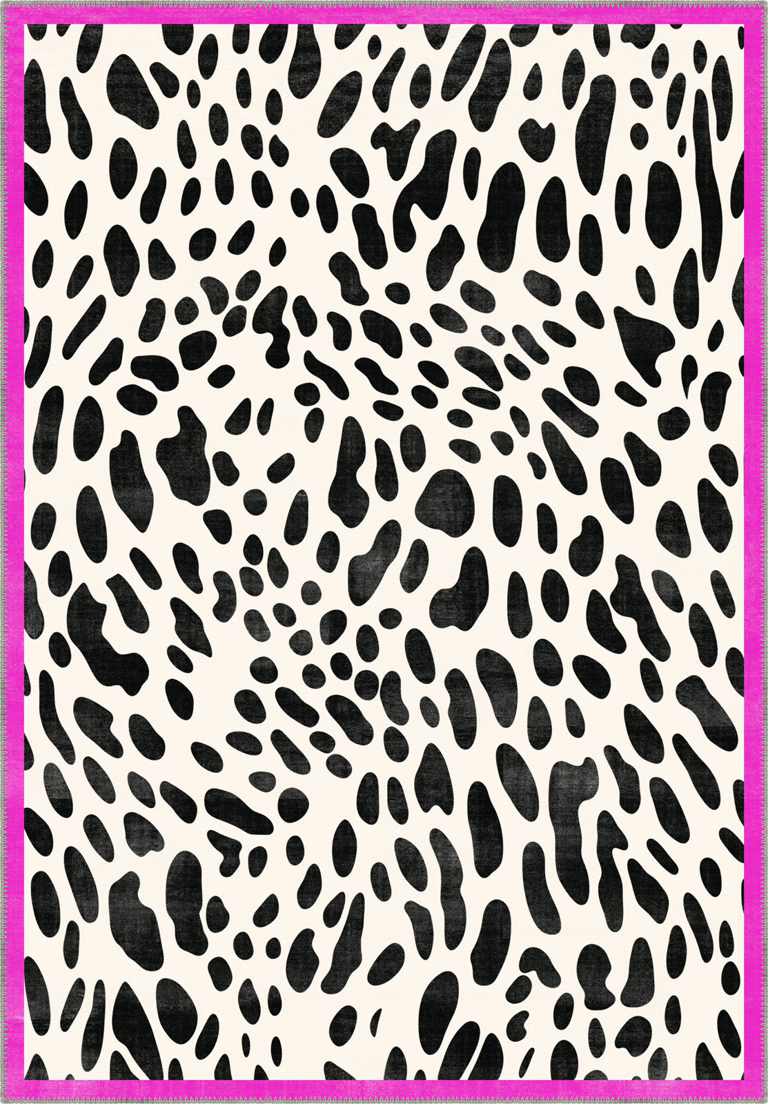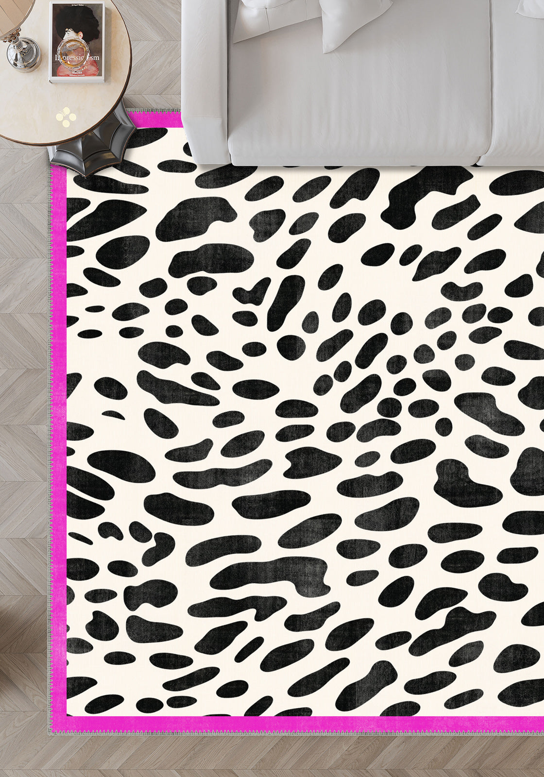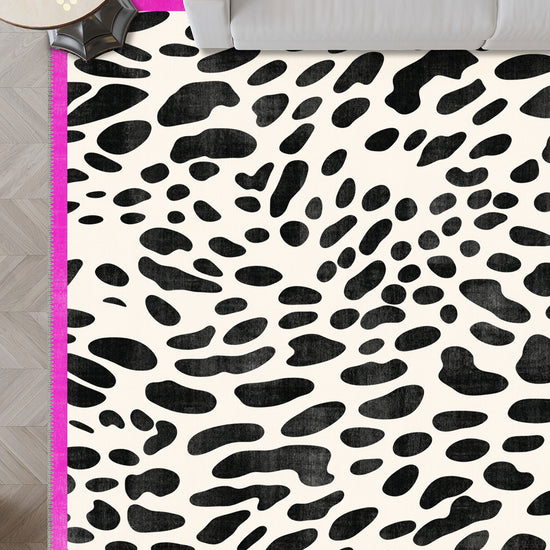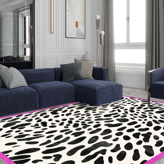 The Dalmatian Pink Bordered Animal Print Rug adds a burst of vibrancy to the classic black and white animal print design with its striking pink border. This rug combines a fun and daring aesthetic with a touch of chic, making it the perfect statement piece for any modern or playful interior.