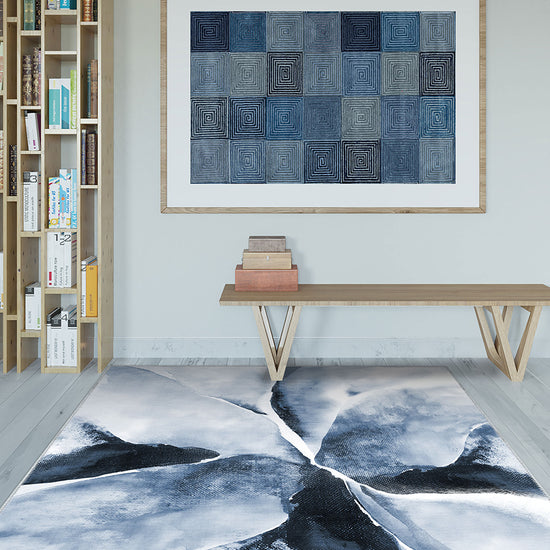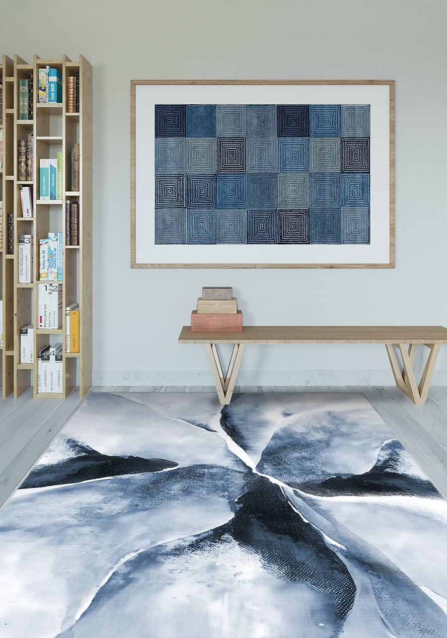 The Delyra Blue Abstract Washable Rug adds artistic sophistication to various spaces: