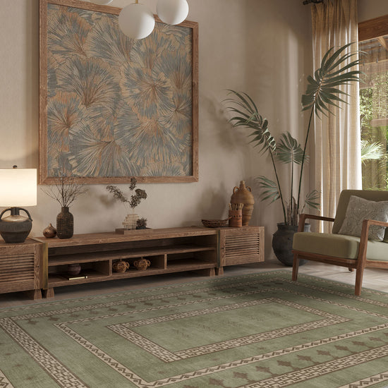 Discover the calming charm of the Desmond Green Washable Rug. Its soothing green tones paired with intricate bohemian-inspired geometric patterns offer a serene and timeless aesthetic that transforms any room into a tranquil retreat. Perfectly balanced with neutral beige detailing, this rug delivers elegance without overwhelming your space.