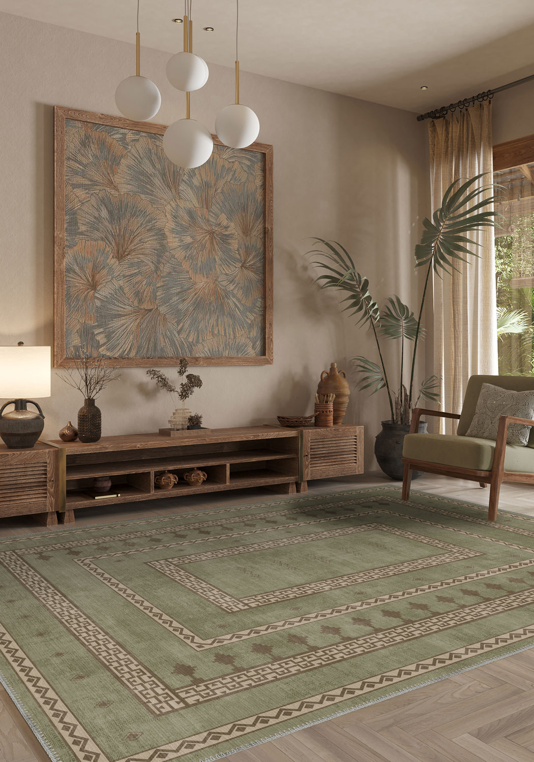 - Serene Bohemian Design – Soft green hues with intricate beige geometric detailing create a calming, refined look.