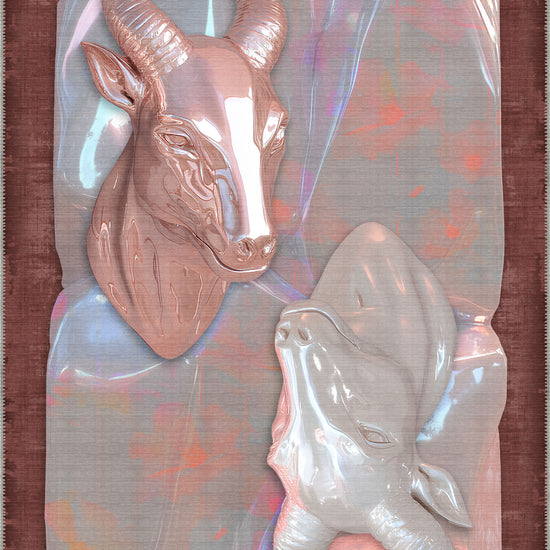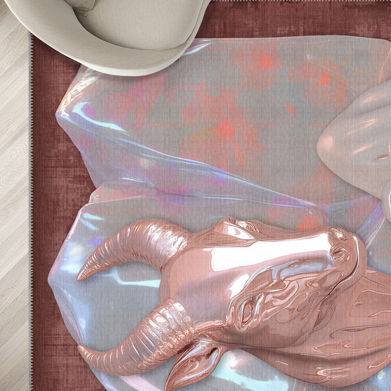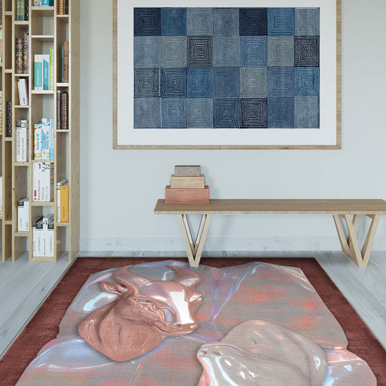 The Duality Surrealist 3D Rug is not just a rug—it’s a visual confrontation. Inspired by contemporary sculpture and surrealist philosophy, this piece features two hyper-real oxen heads emerging from a rippling illusion of polished stone. The composition evokes themes of conflict, reflection, and transformation, grounded in a palette of burnished rose, cool lilac, and smoky burgundy. It's at once primal and futuristic—an art piece that lives underfoot.
