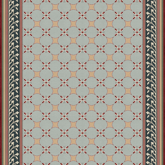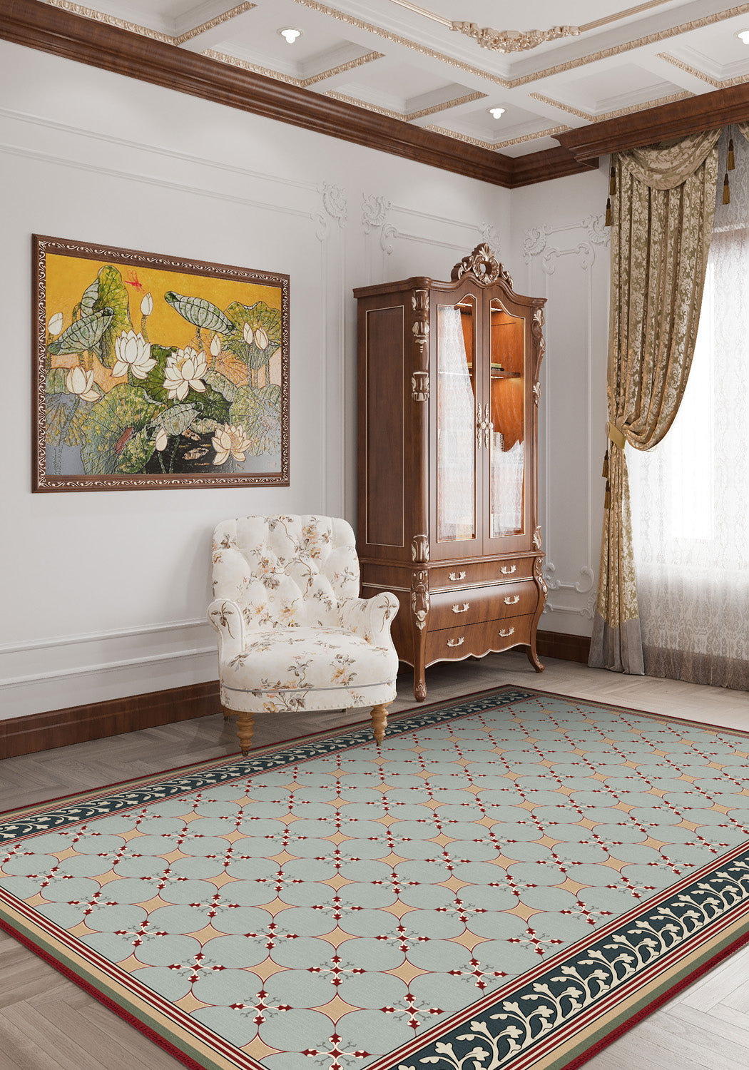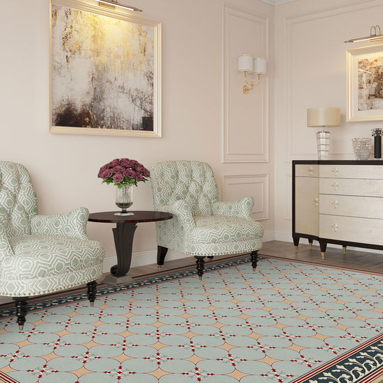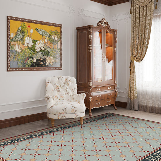 Inspired by the architectural rhythm of European mosaics and noble entry halls, the Eloise Vintage Trellis Tile Rug strikes a perfect balance between symmetry and softness. Its duck egg blue base lays a calming foundation, while terracotta-toned lattice work dances playfully with small ruby floral accents. This tile-inspired motif is framed by a striking black and cream leaf border—like a corridor lined with painted columns.