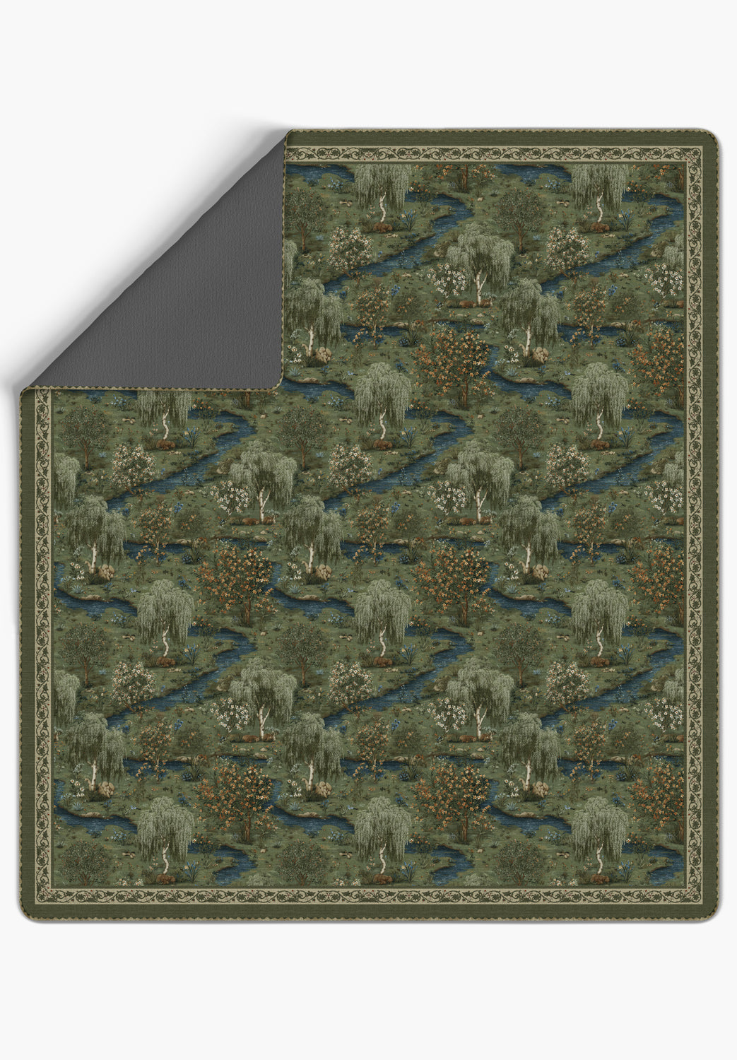 This forest green blanket bedspread brings narrative and atmosphere into a room. The repeating pastoral motif feels collected and timeless, offering depth without visual heaviness.