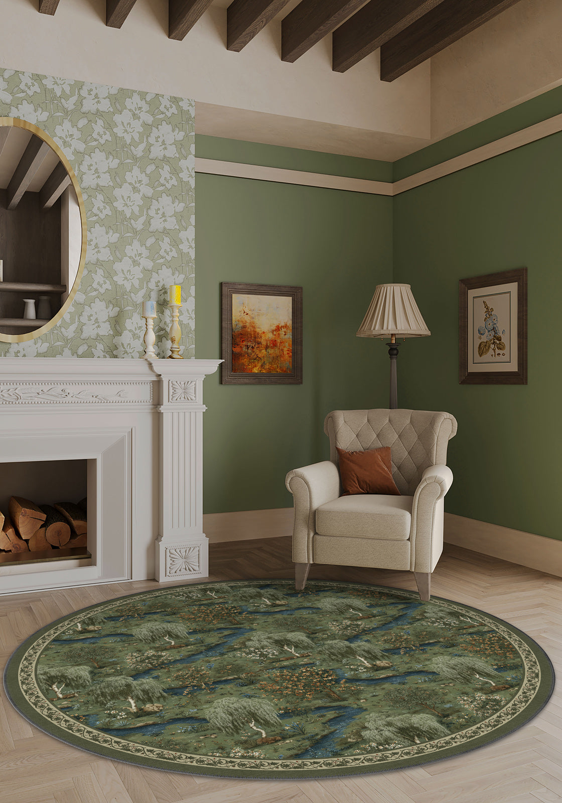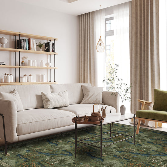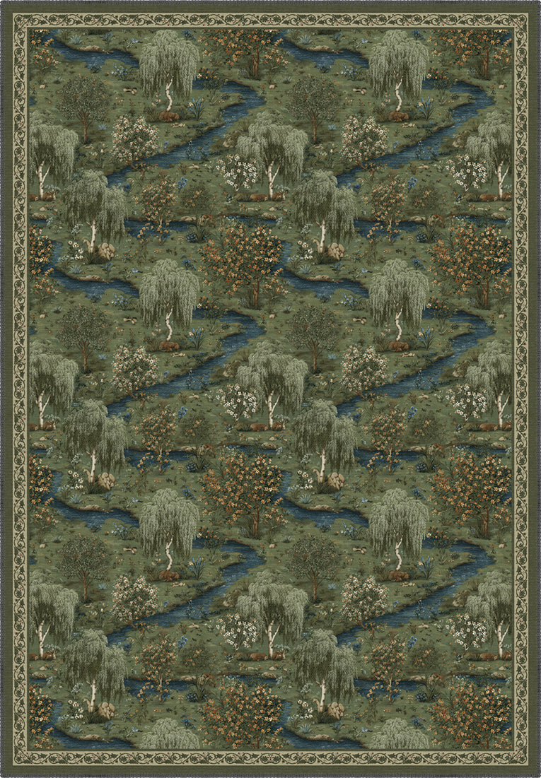 Wander through a storybook landscape every time you step across the Elowen Forest Washable Rug. This enchanting cottagecore rug brings to life a painterly forest scene, complete with willow trees, wildflowers, and a meandering stream in rich moss green and earthy tones. It’s a gentle escape to a countryside idyll—no wellies required.