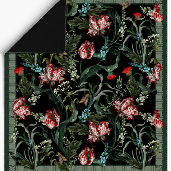 The Evelina Botanical Black Bedspread Blanket is a richly detailed statement piece, created for interiors that appreciate drama softened by nature. Set against a deep black ground, painterly florals in warm reds, soft creams and layered greens unfold with elegant movement, giving the design a romantic yet composed presence. It feels expressive without excess, bold yet beautifully balanced.