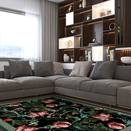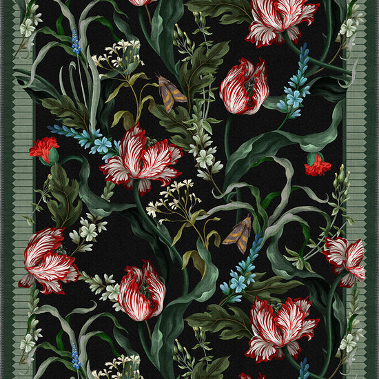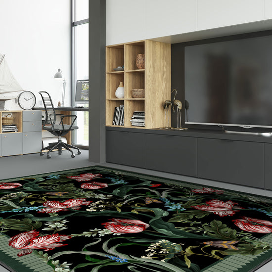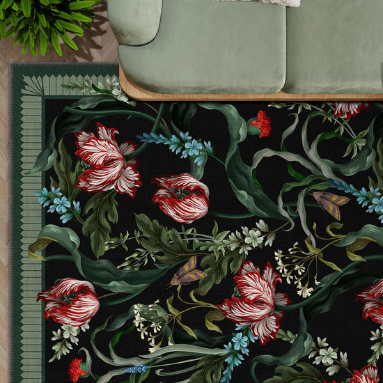 From the curling foliage to the bold red tulips, every element of this botanical rug feels alive with movement. The green border frames the composition with structure, balancing the abundance within. The contrast of green and black ensures this green black rug stands out while harmonising beautifully with both modern and vintage interiors.