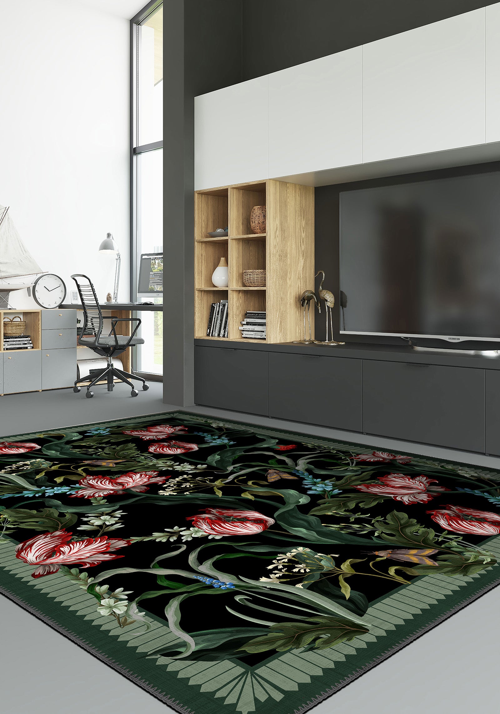 The Evelina Botanical Rug is a dramatic celebration of nature’s beauty, designed to feel like a moonlit garden at your feet. With its deep black backdrop and sweeping green leaves, the rug sets the stage for crimson-and-ivory tulips and delicate wildflowers to flourish in painterly detail. As a tulip rug with rich floral artistry, it transforms any room into a bold and romantic statement.