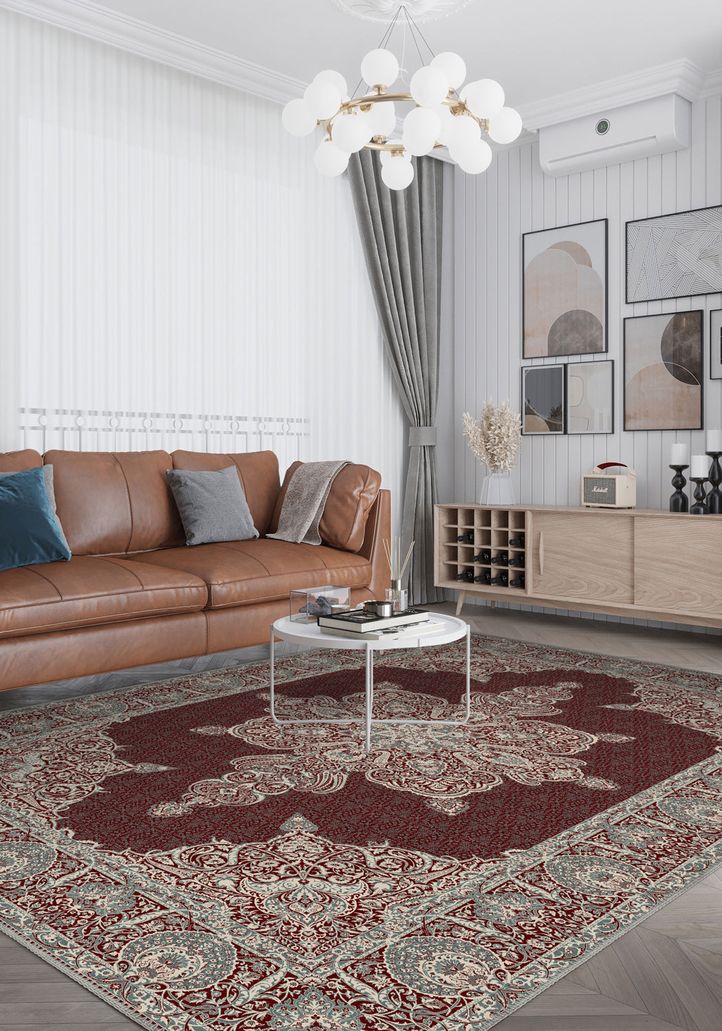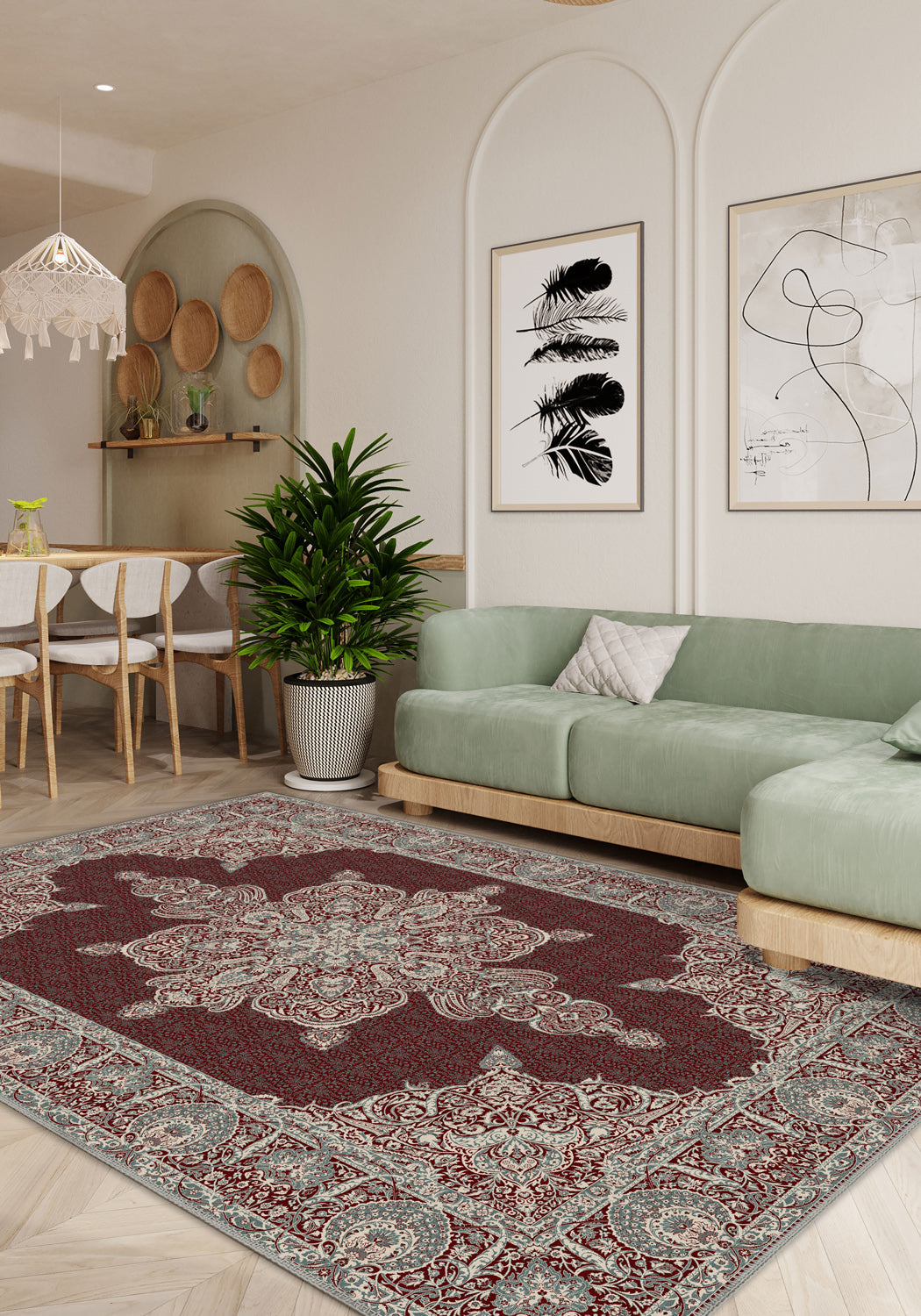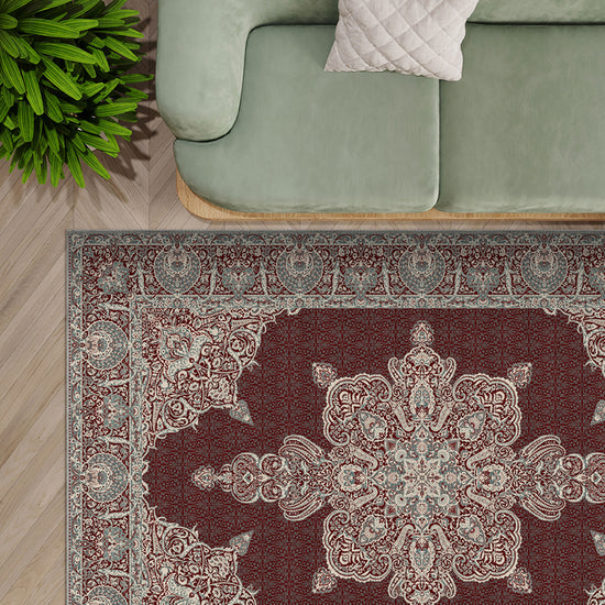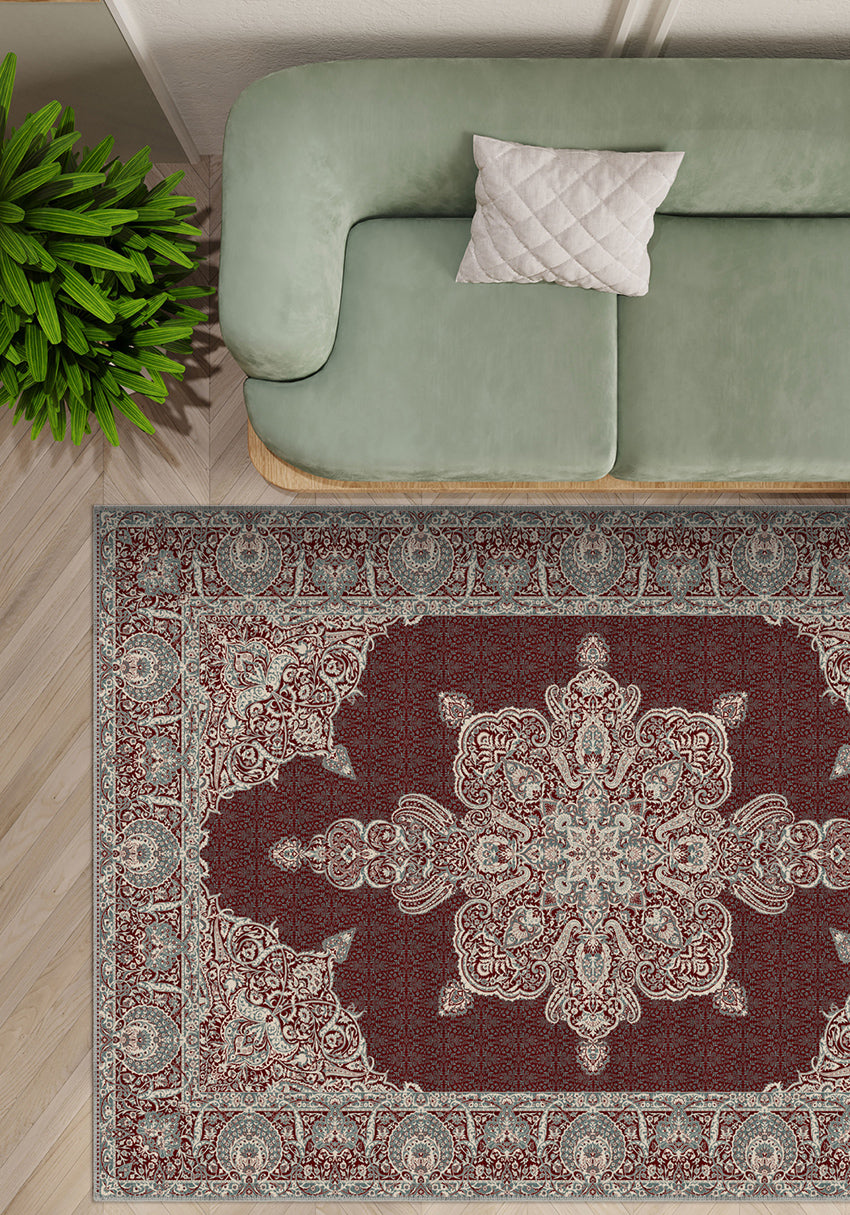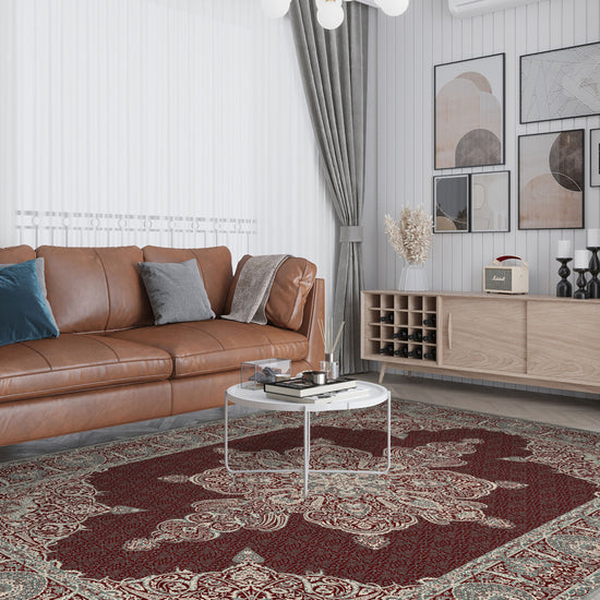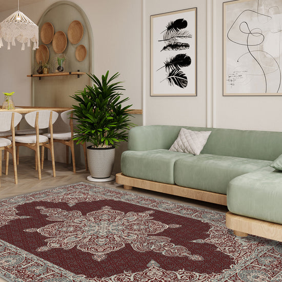 The Farinda Burgundy Persian Rug is not just a floor covering—it's an heirloom in the making. With its rich burgundy base, ornate floral medallion, and elaborate corner detailing, this piece feels like a love letter to Persian palaces and story-filled salons. The symmetry is impeccable, the intricacy breathtaking. Each swirl and curlicue, each turquoise and ivory accent, is drawn from centuries-old motifs yet softened into something serenely modern.