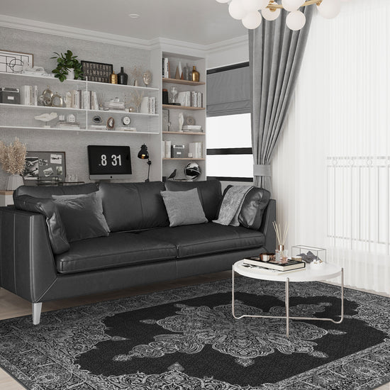 Dark, dramatic, and unapologetically ornate—the Farinda Persian Inspired Baroque Rug is where Persian tradition meets high-contrast glamour. Its black canvas is intricately woven with frosty silver motifs: a commanding central medallion radiates outward in perfect symmetry, anchored by grand corner flourishes and framed by rosette-lined borders. It’s a rug that feels both regal and mysterious, like something belonging to an old-world opera house or a moody palace interior.