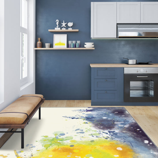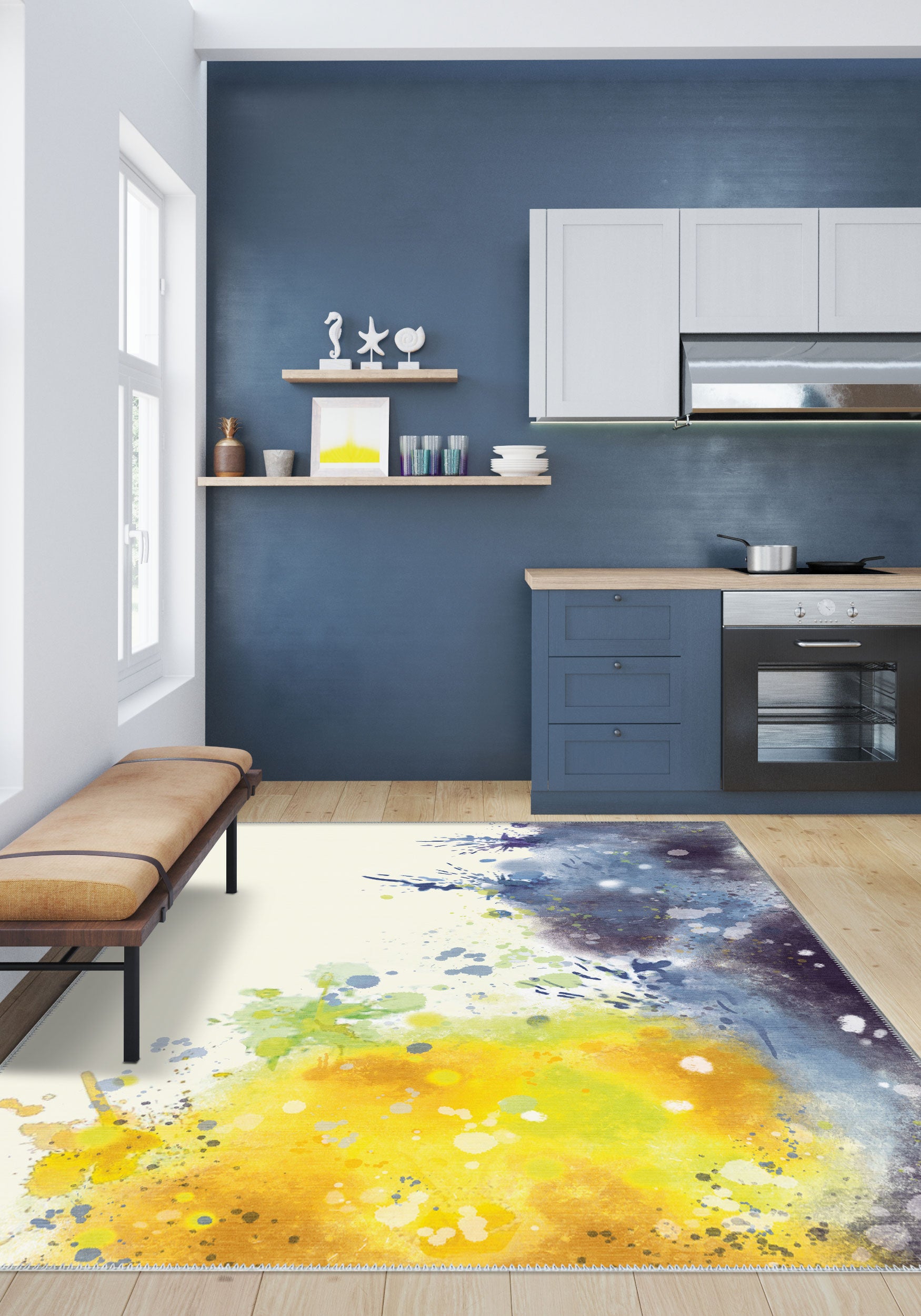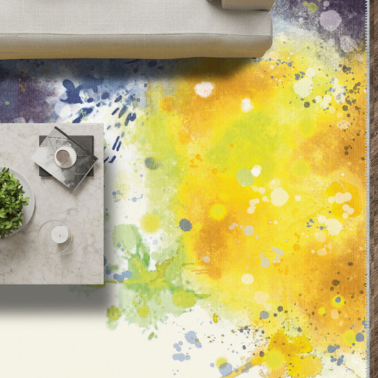 The Fenwick Yellow Blue Washable Rug combines practicality with a bold artistic design, making it a standout piece that brings joy and energy to your space while ensuring easy maintenance.