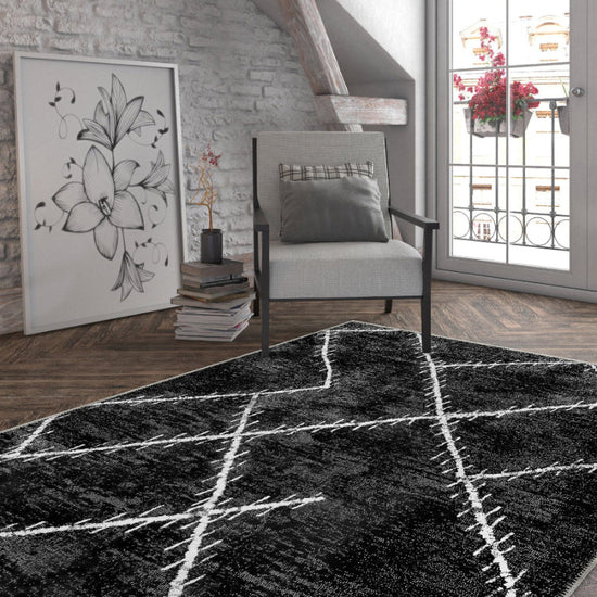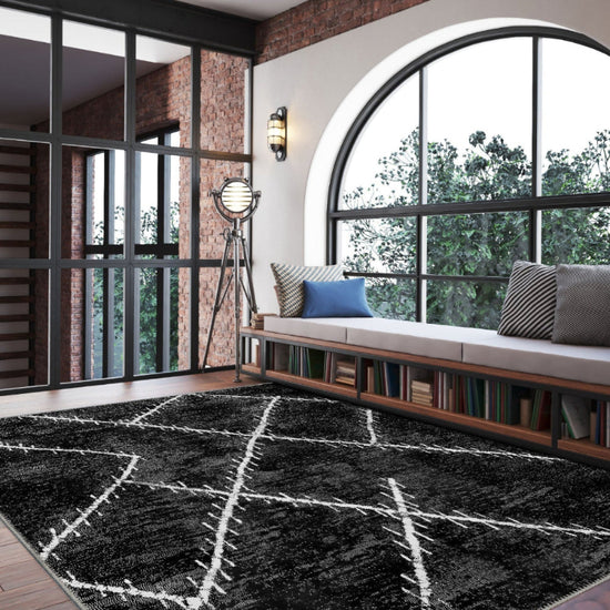 The Freya Black Geometric Rug adds a bold yet sophisticated touch to any space. With its striking white geometric pattern set against a deep black background, this rug offers a sleek, modern look that complements a variety of interior styles. Perfect for those who appreciate contemporary design with a unique twist.