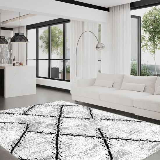 The Freya White Geometric Washable Rug combines minimalist design with modern practicality. Its elegant white backdrop, intersected by bold black geometric lines, creates a dynamic, visually appealing pattern that effortlessly enhances any space. Designed to be both stylish and functional, this rug is ideal for high-traffic areas, providing easy maintenance with its washable feature.