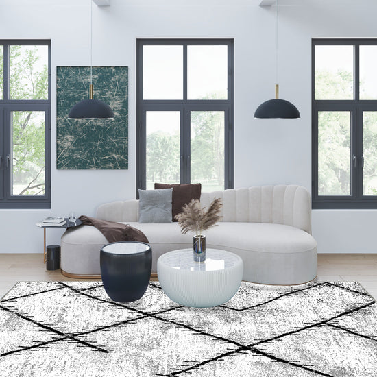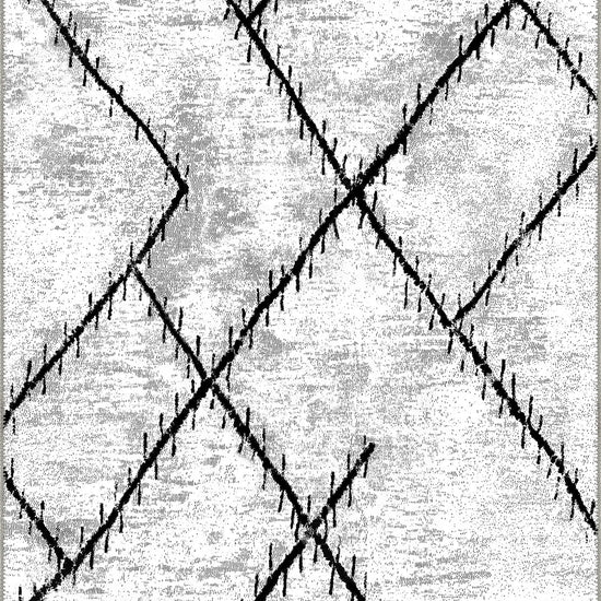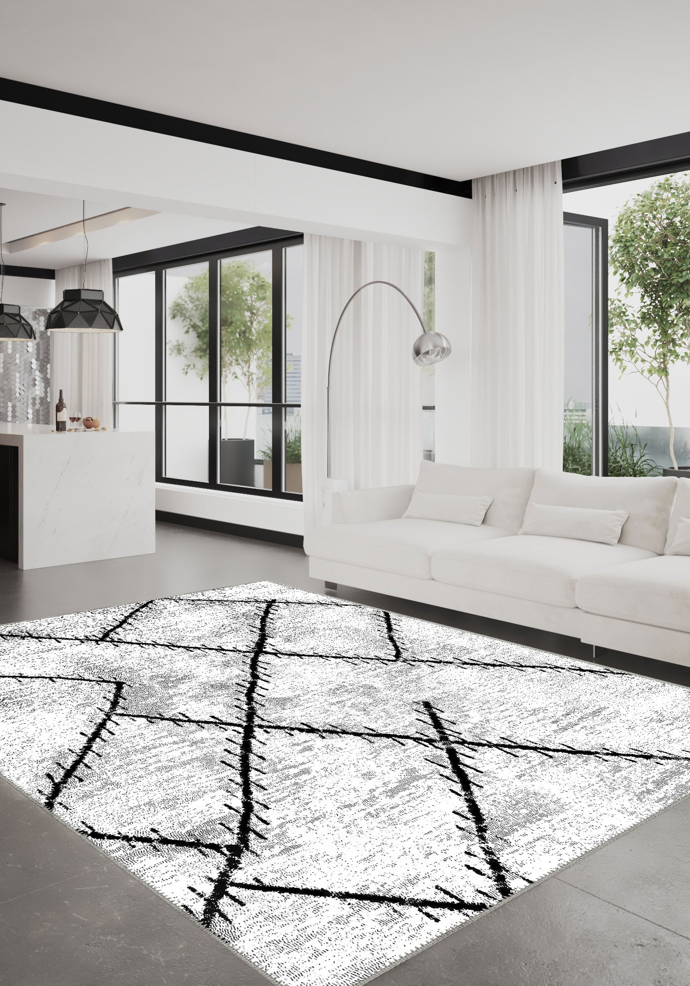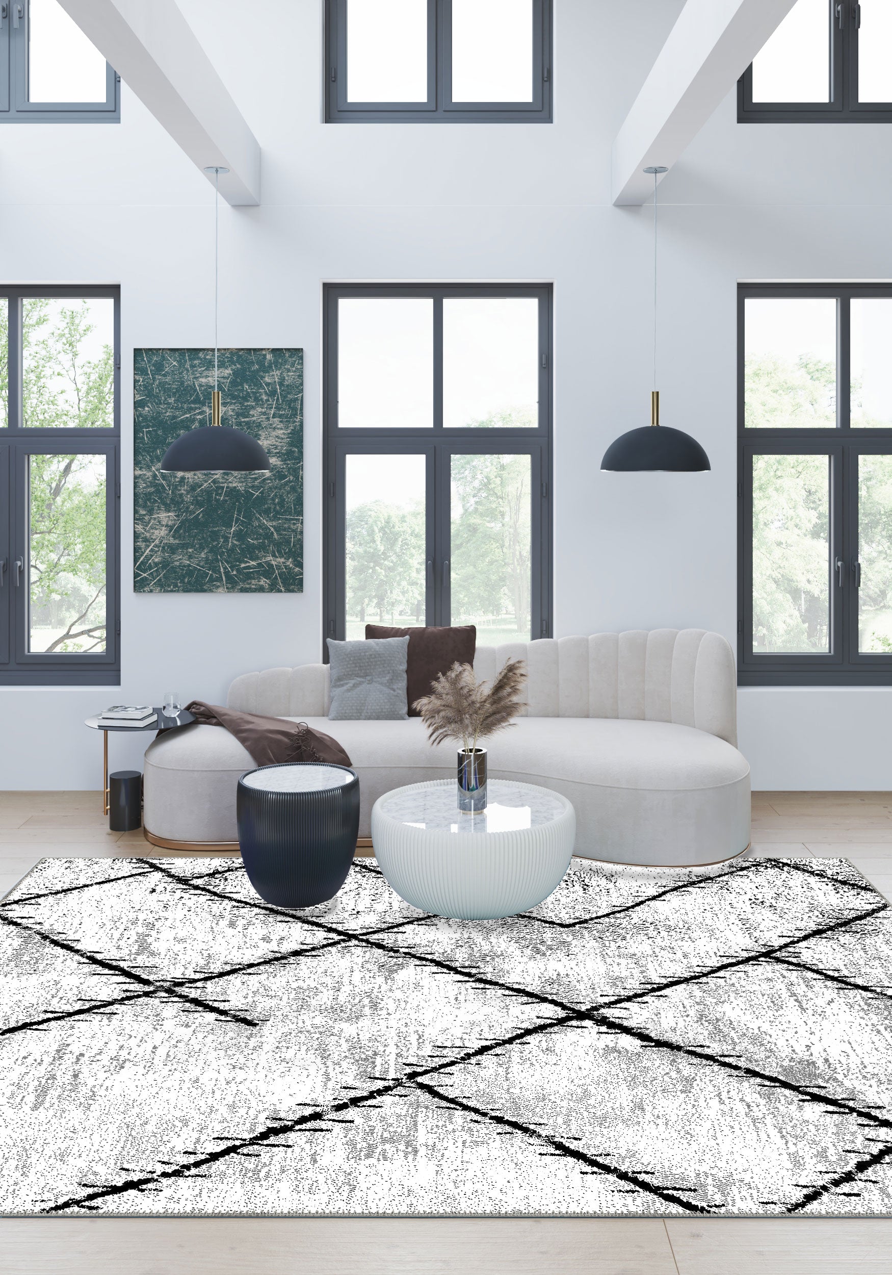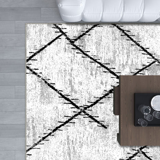 - Minimalist Geometric Pattern: Featuring intersecting black lines across a white base, the Freya rug offers a striking geometric pattern that adds depth and modern flair to any room.