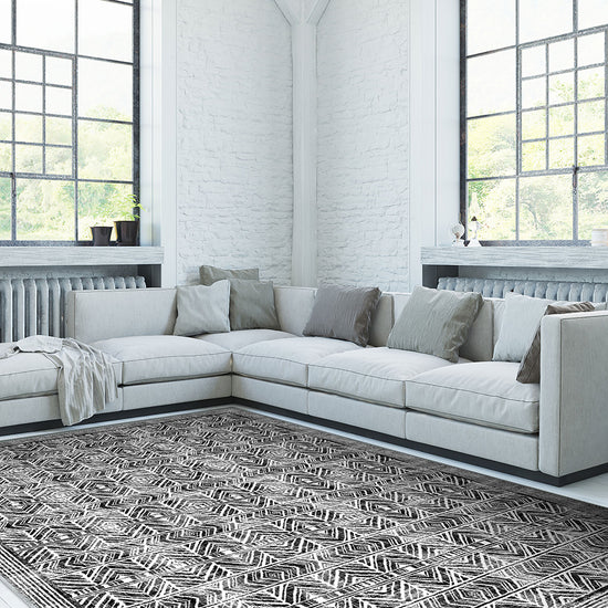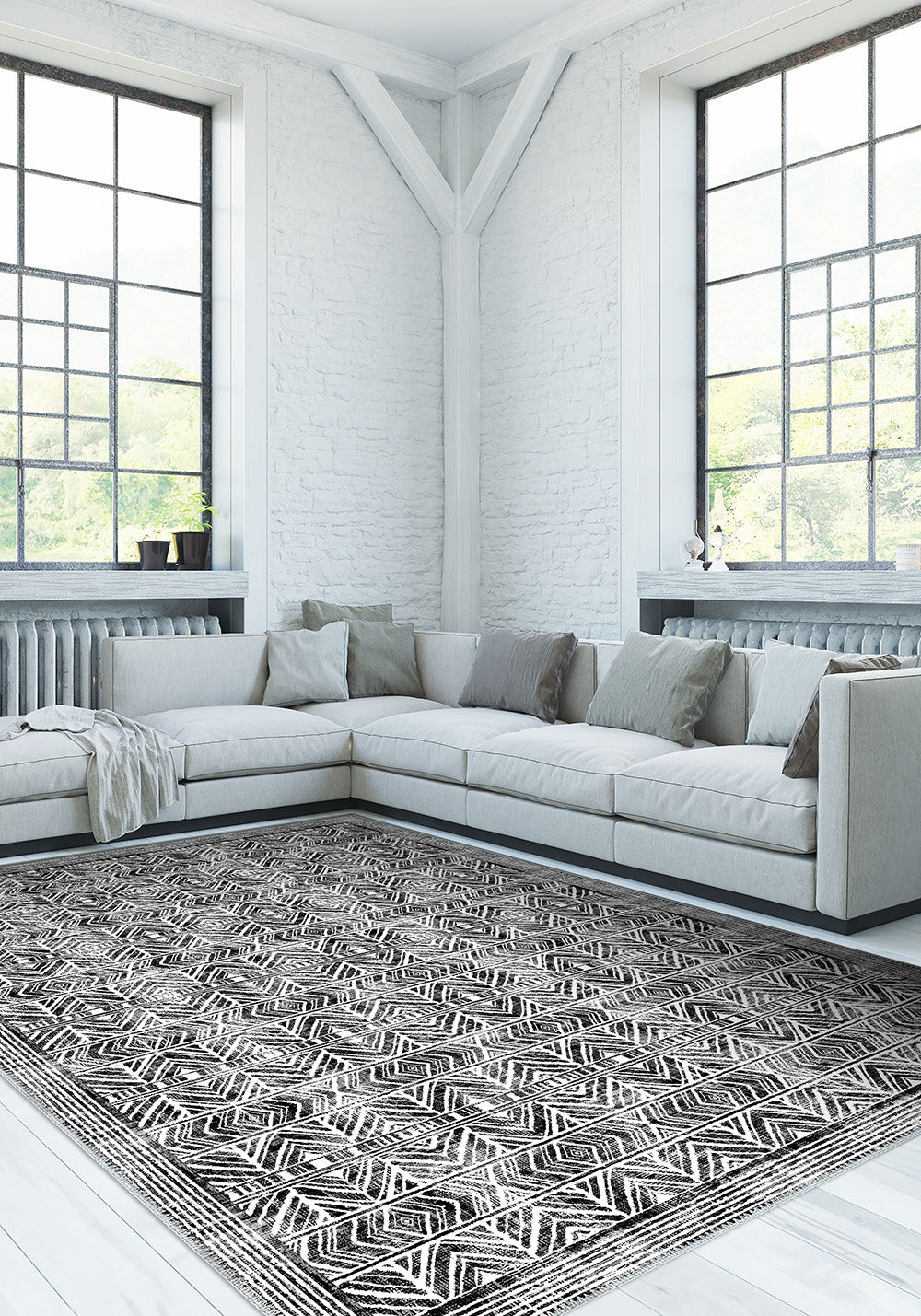 The Gilyra Black and White Boho Rug adds a modern, artistic flair to various spaces:
