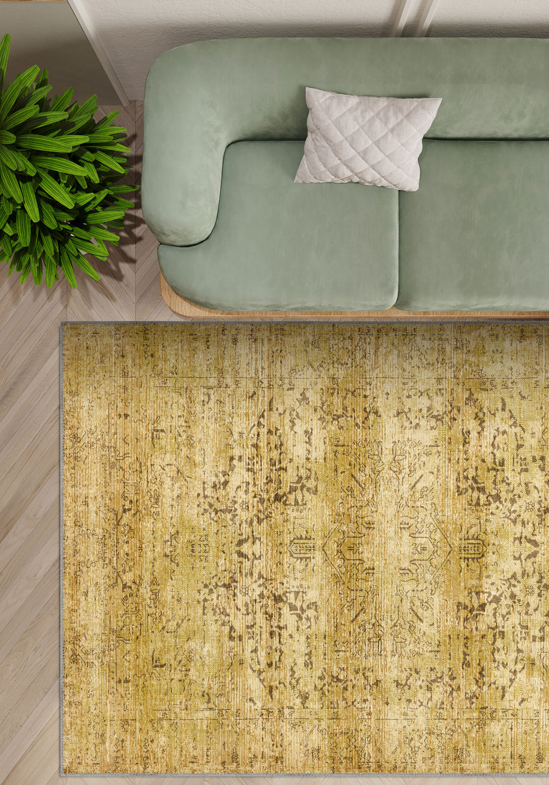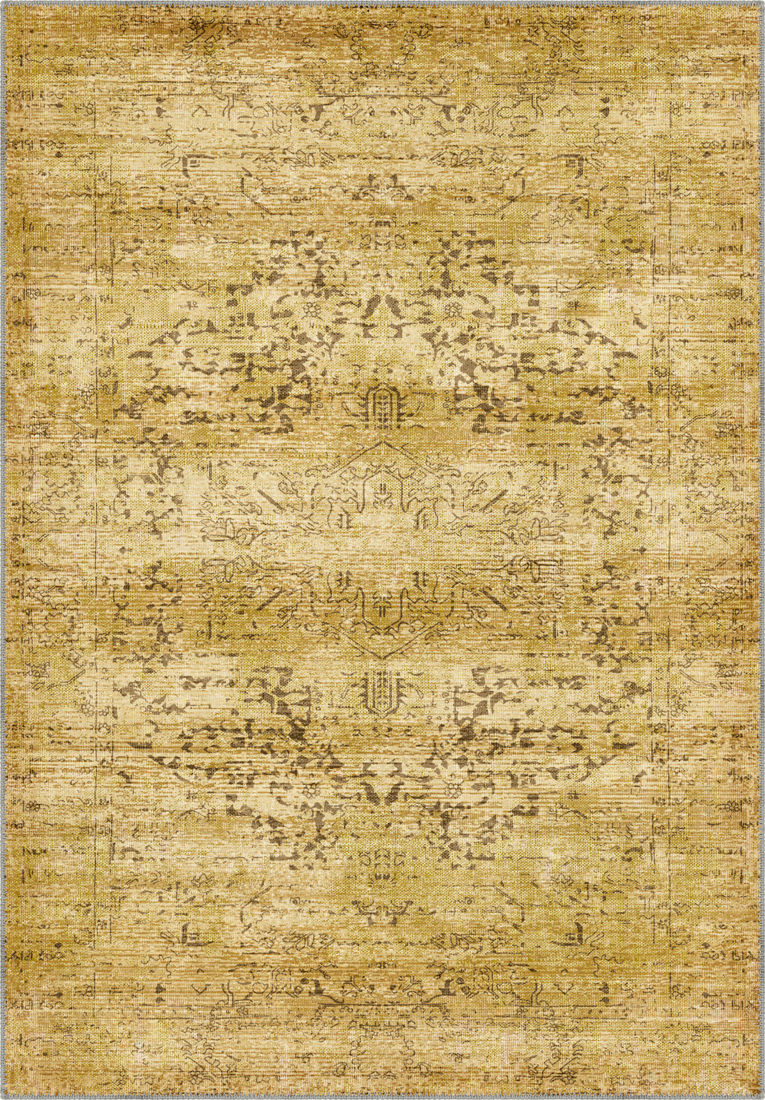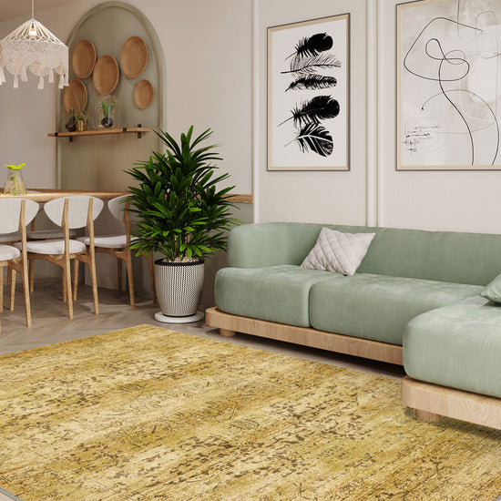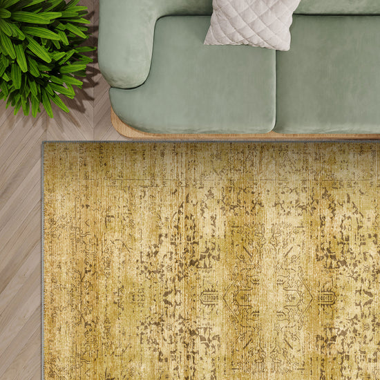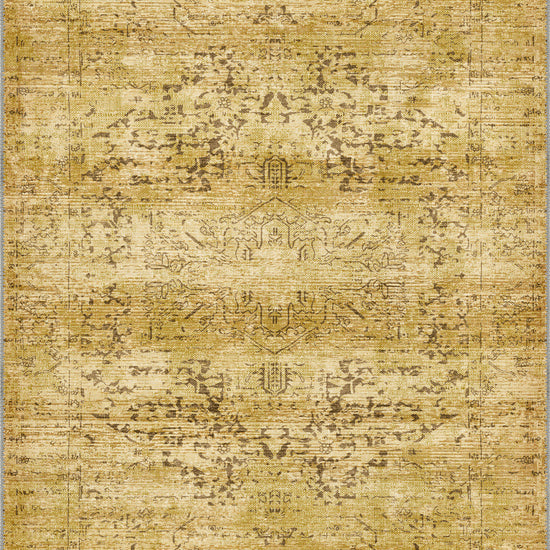 The Hudson Yellow Medallion Rug features intricate medallion patterns in a vibrant yellow hue, softened by a distressed finish for a vintage-inspired aesthetic. Its cheerful yet sophisticated design makes it a standout addition to any room, offering both charm and practicality.