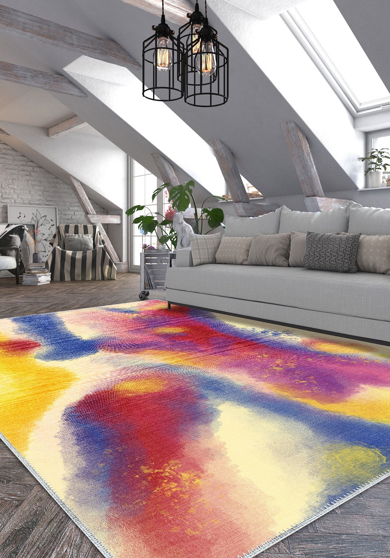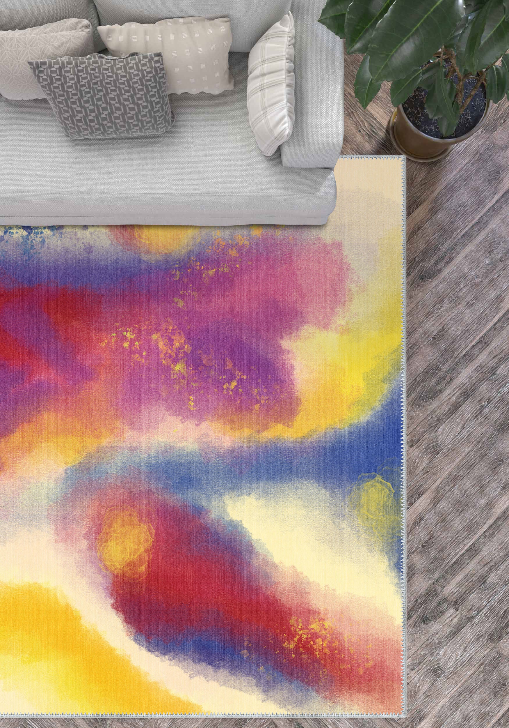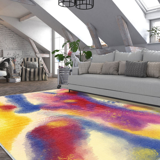 - Vibrant Abstract Design: The rug’s expressive pattern of reds, blues, and yellows creates a dynamic, visually stimulating effect, perfect for adding personality to your decor.