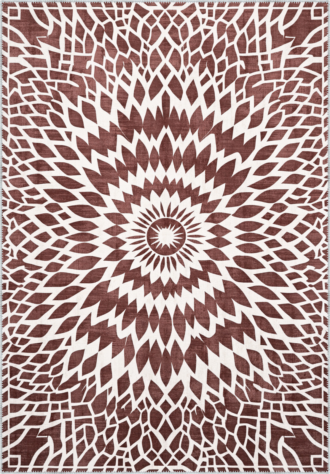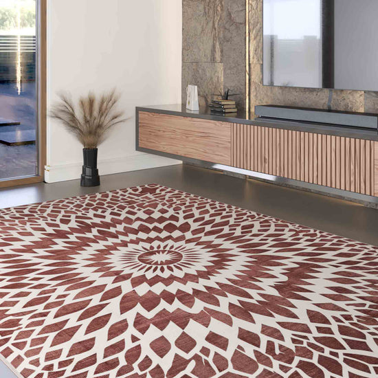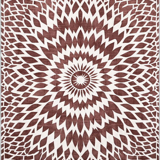 The Juno Washable Burgundy Rug showcases a striking geometric starburst pattern that brings boldness and energy to any room. With its deep burgundy tones and intricate white detailing, this rug is the perfect statement piece to elevate your home decor while offering the convenience of easy care, thanks to its washable design.