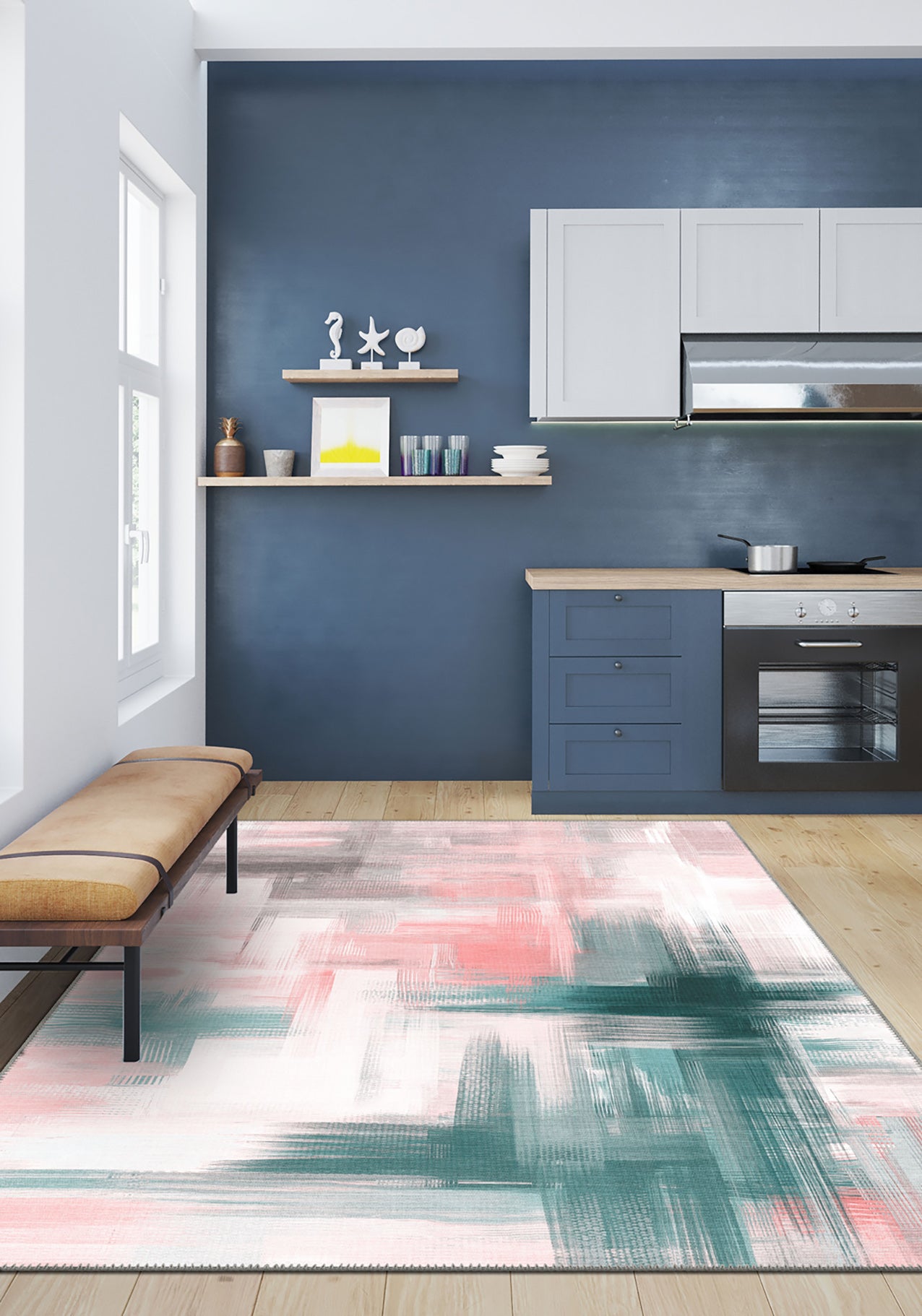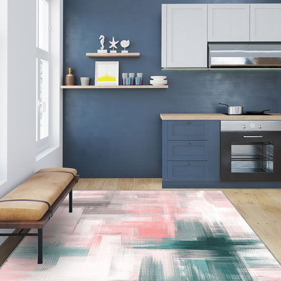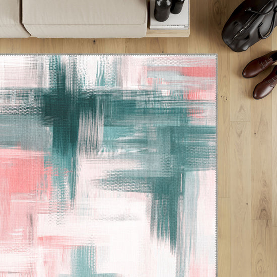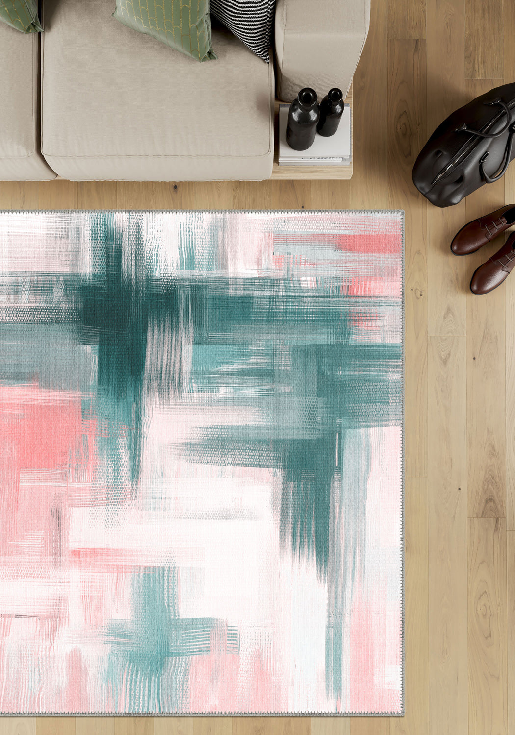 The Kasen Abstract Pink Rug feels like a bold expression on canvas—brushed into being with layers of coral pink, soft blush, forest green, and cloudy white. With a design that echoes contemporary art, this rug brings energy, colour, and movement into the room. Every stroke is textured with painterly intent, making it perfect for those who love creativity underfoot. It’s the kind of piece that doesn’t just blend in—it transforms a space.