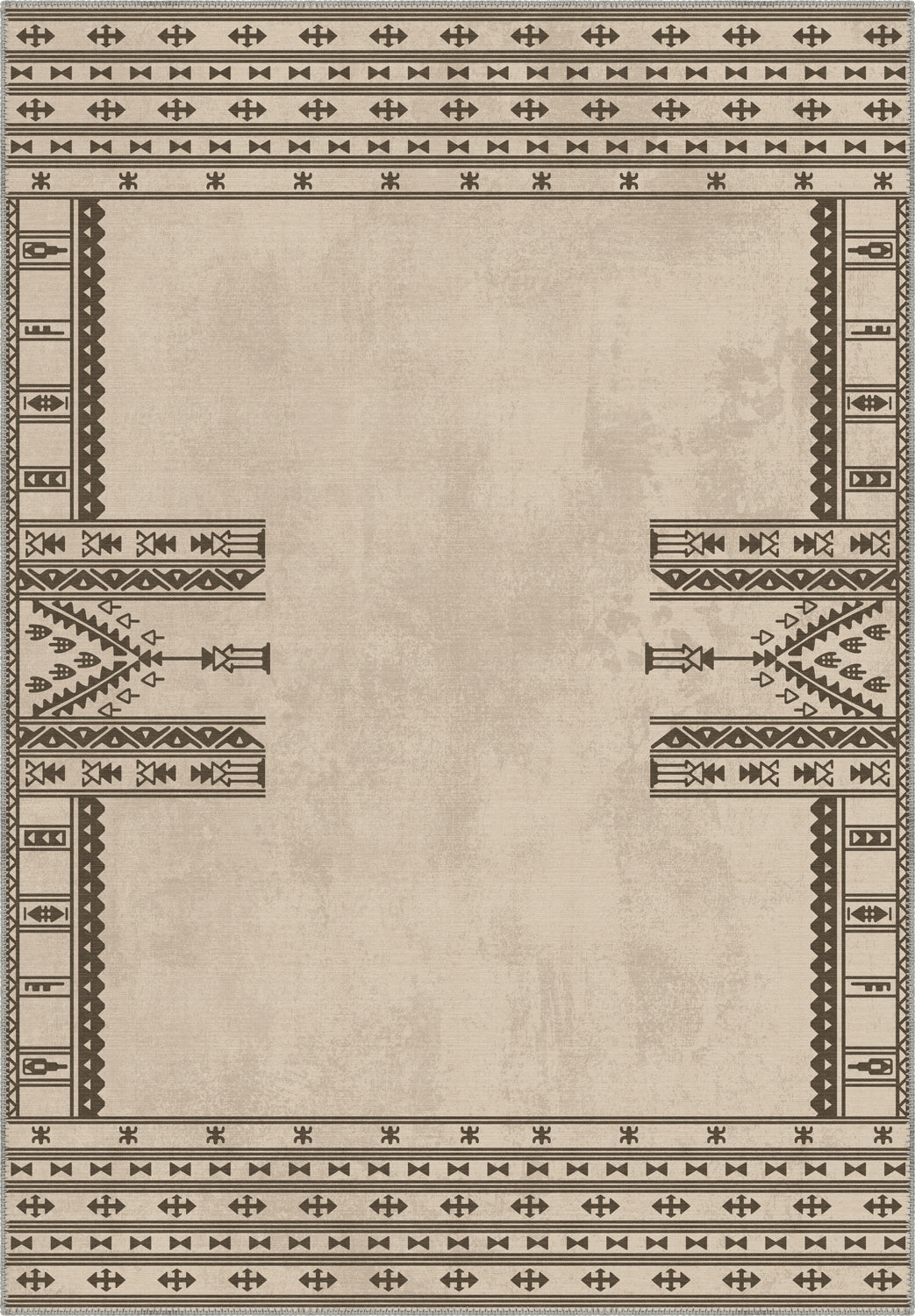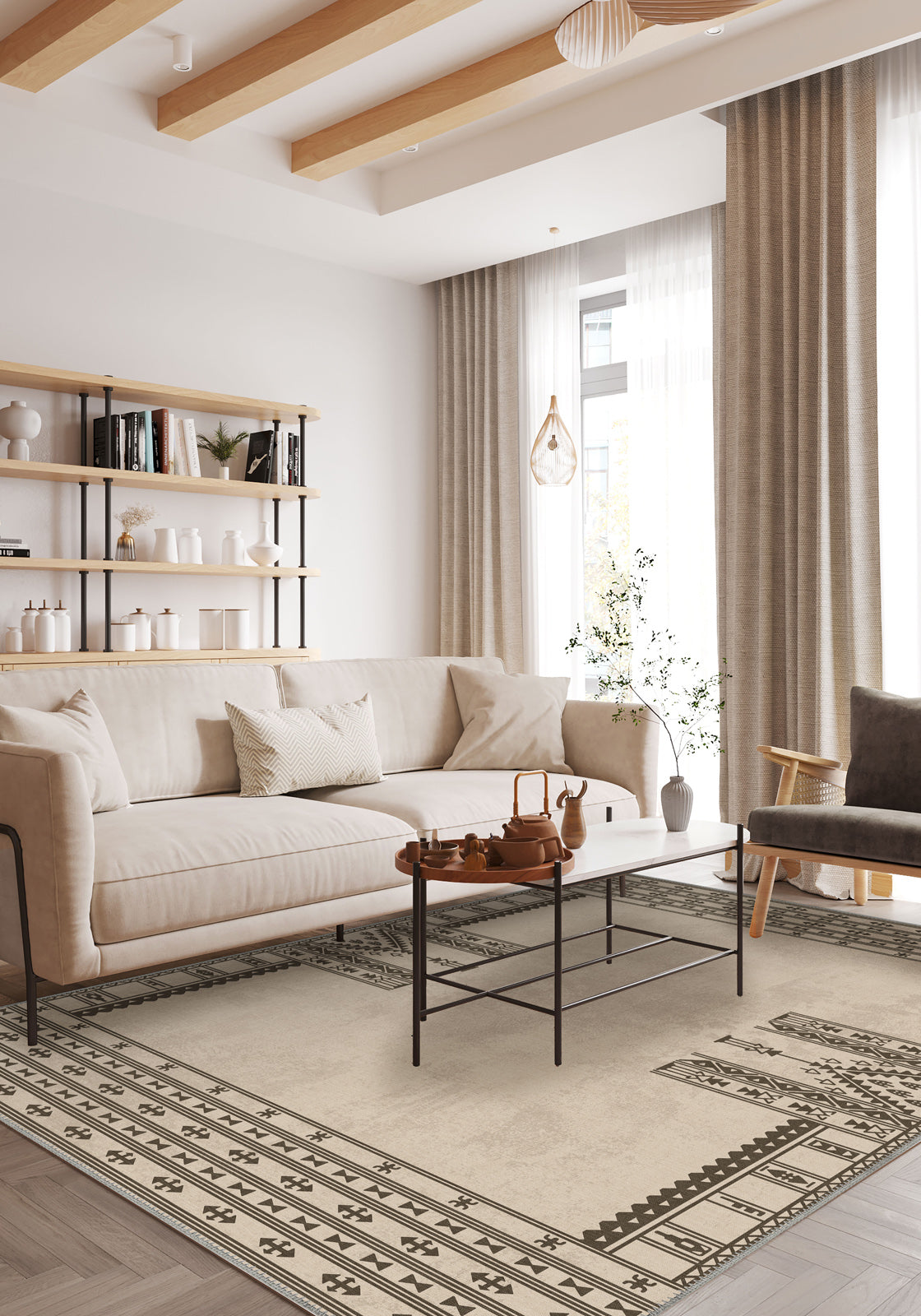 The Kora Beige Nordic Rug is the kind of understated elegance that makes a home feel intentionally curated. With its soft beige backdrop and symmetrical tribal motifs framing the edges, this design brings a grounded, serene feel to any room—like a morning in a quiet Nordic cabin with light pouring in from timber-framed windows. This piece is a love letter to Scandinavian balance—where minimalism doesn’t mean emptiness, but clarity.