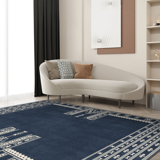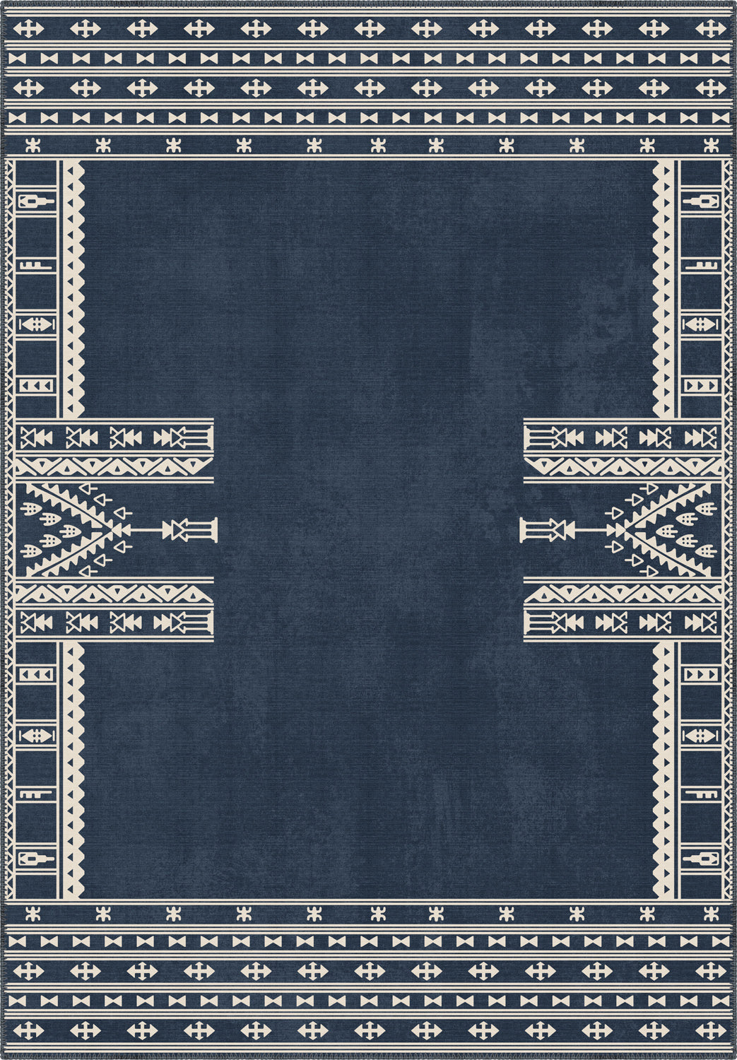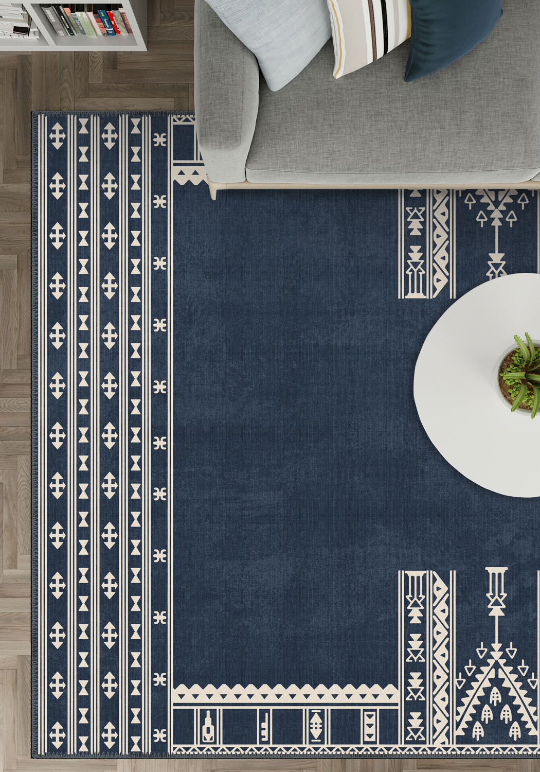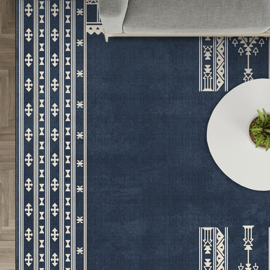 The Kora Navy Scandi Rug is what happens when minimalist Scandinavian design meets unapologetic confidence. Deep navy blue grounds the space with authority, while crisp cream tribal borders add just the right amount of movement and graphic punch. It's not just a rug—it's a frame for your furniture, a canvas for your lifestyle. This modern take on Nordic design brings structure and soul into any room it touches.